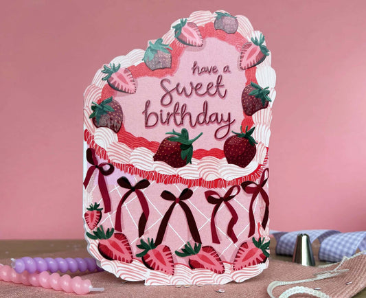 Sweet Birthday Strawberry Spot Varnish Cutout Heart Cake Birthday Card