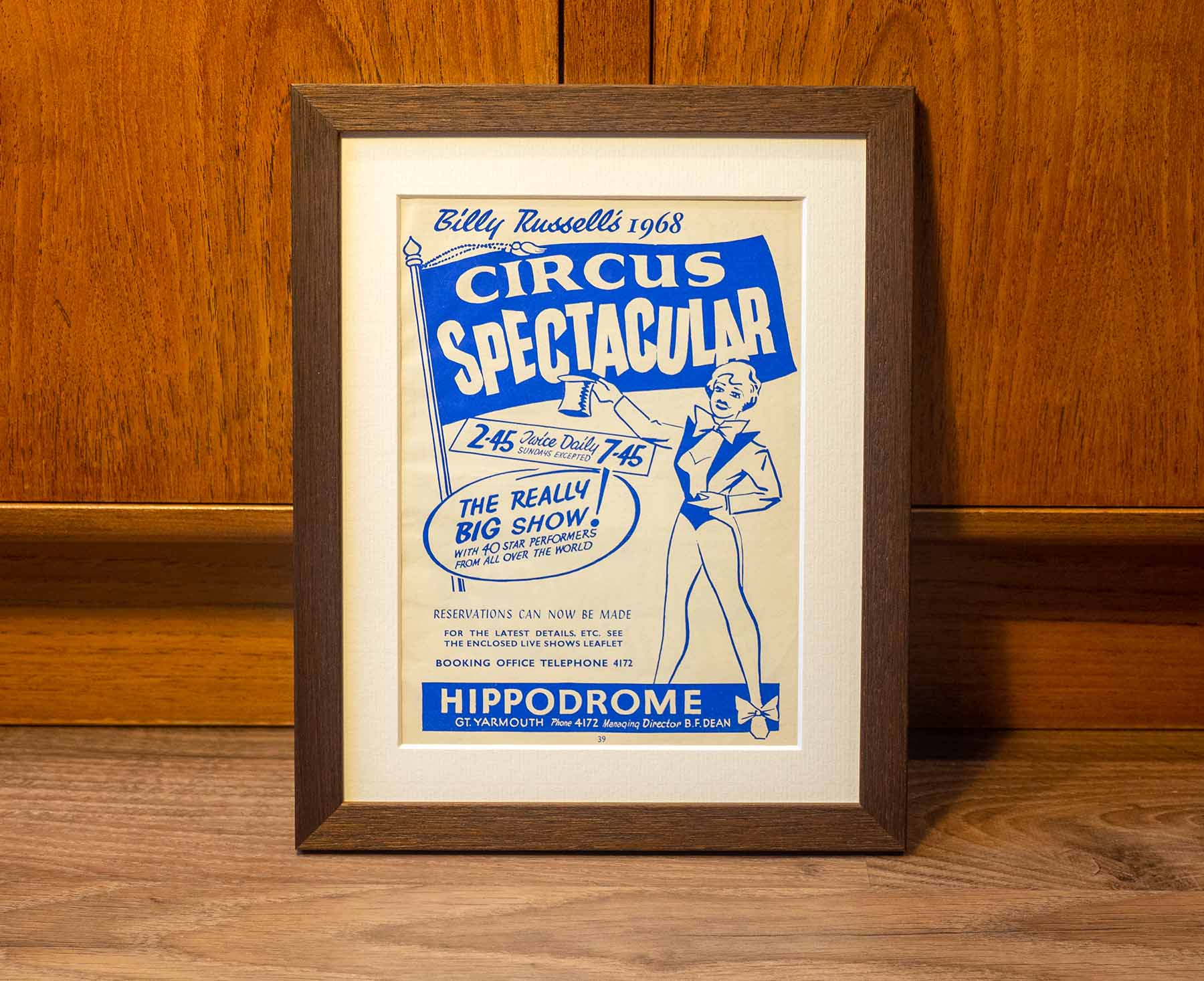 Roll up, roll up, the circus is here! This classic advert evokes circuses of days gone by. It promotes Billy Russell's Circus at the Great Yarmouth Hippodrome, with a beautifully illustrated female MC in a vibrant blue! We have a few different ads for this Circus from the 60s and 70s, including this same design in black. It would look great on any wall and as with all of our vintage items, it is a genuine original item, no reproductions or reprints here!