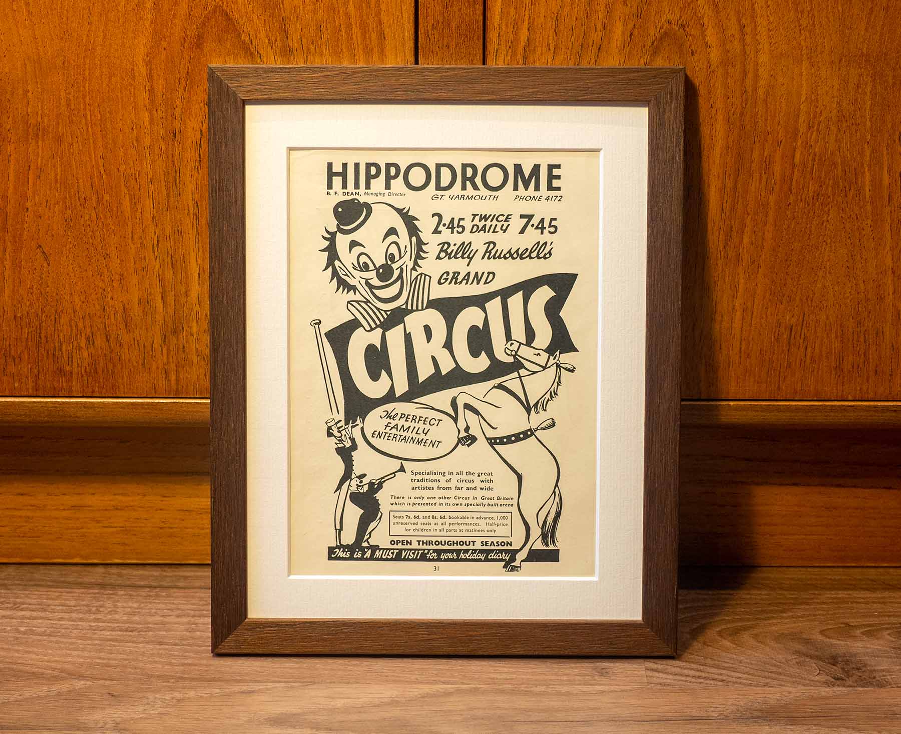 Roll up, roll up, the circus is here! This classic advert evokes circuses of days gone by. It promotes Billy Russell's Circus at the Great Yarmouth Hippodrome. This particular ad features wonderfully illustrated clowns and a beautiful horse. We have a few different ads for this Circus from the 60s and 70s. It would look great on any wall and as with all of our vintage items, it is a genuine original item, no reproductions or reprints here!