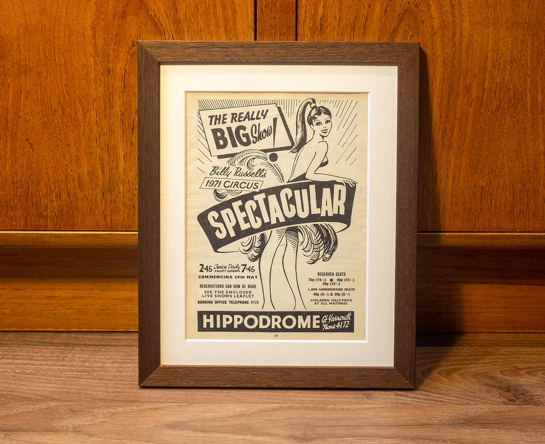 Roll up, roll up, the circus is here! This classic advert evokes circuses of days gone by. It promotes Billy Russell's Circus at the Great Yarmouth Hippodrome, with its glamourous and beautifully illustrated feather girl. We have a few different ads for this Circus from the 60s and 70s. It would look great on any wall and as with all of our vintage items, it is a genuine original item, no reproductions or reprints here!