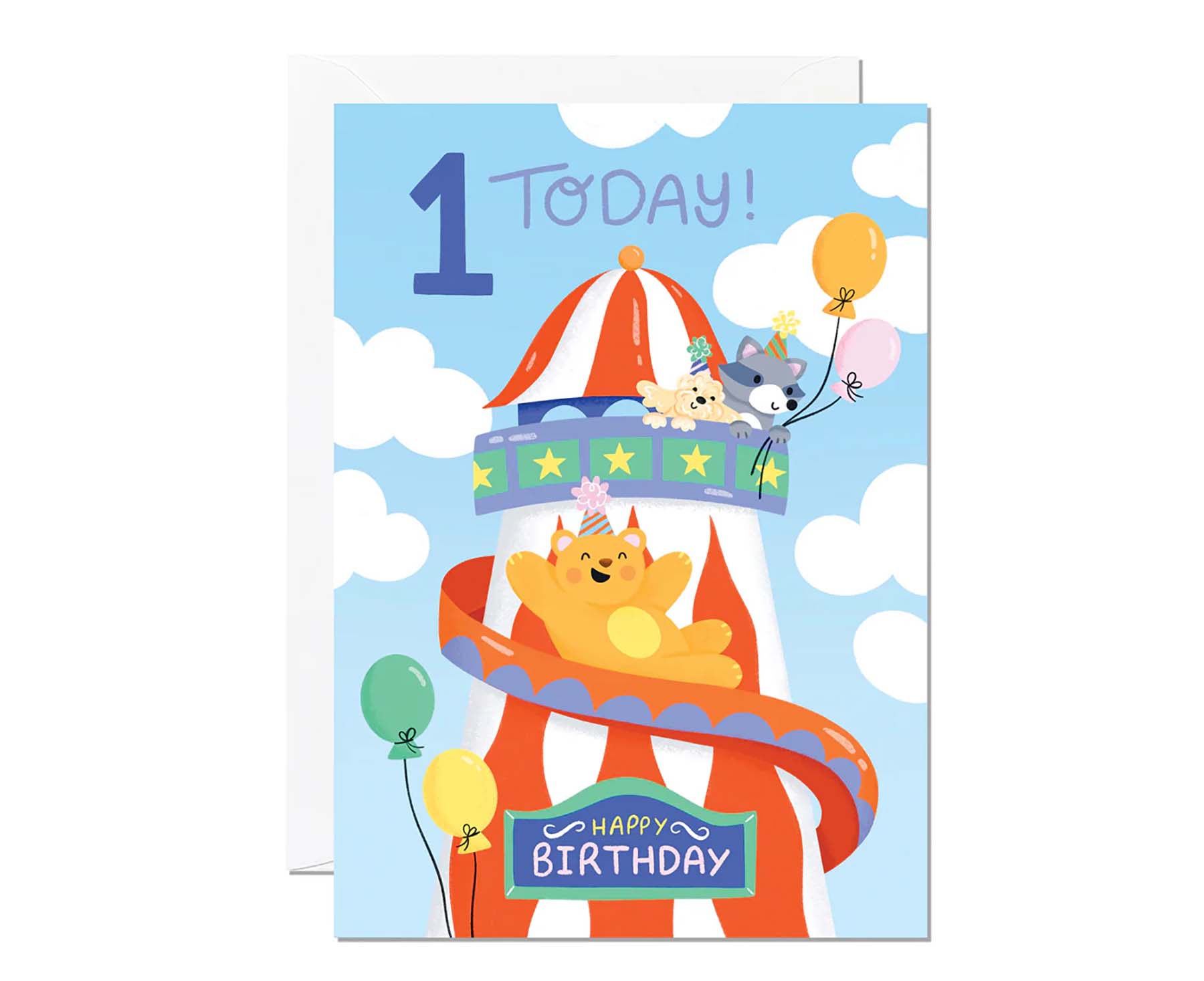 Make a birthday as much fun as these animals are having on this stripey Helter Skelter, with this colourful first birthday card. Like everything from Ricicle Cards it's printed on sustainable 280gsm stock in the UK and is paired with a suitably luxurious envelope.