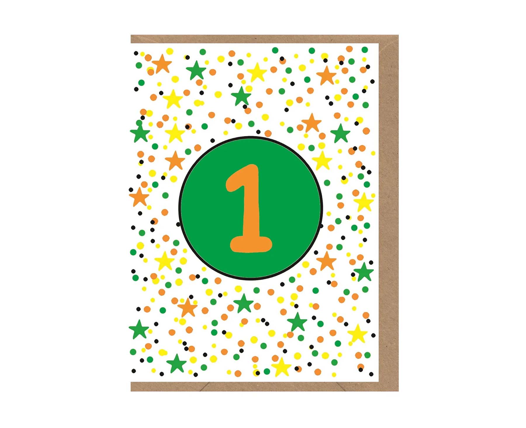 Part of Earlybird's fabulous range of neon mini cards with glorious embossing and spot UV, this mini first birthday card is covered in spots and stars and a number 1!