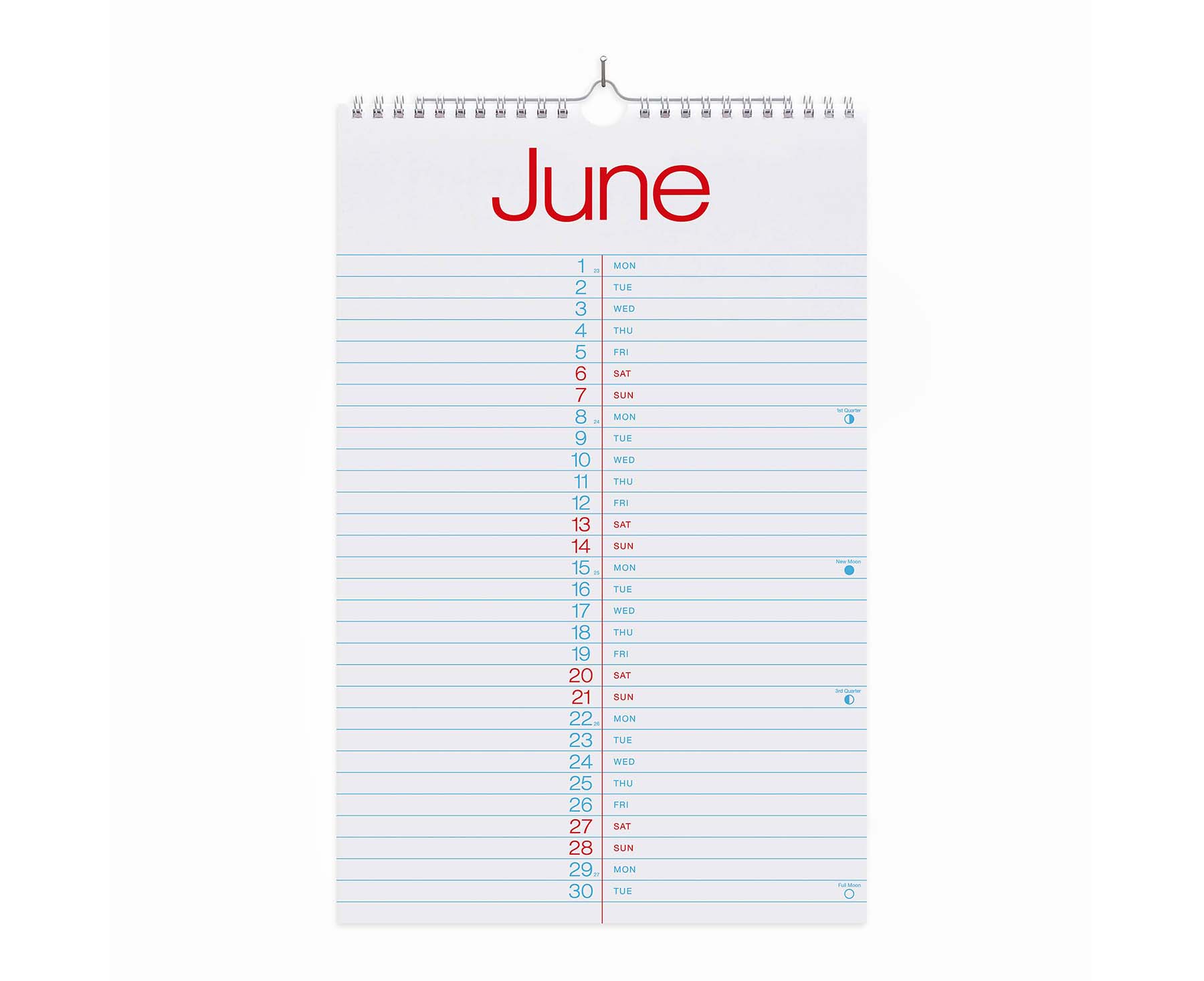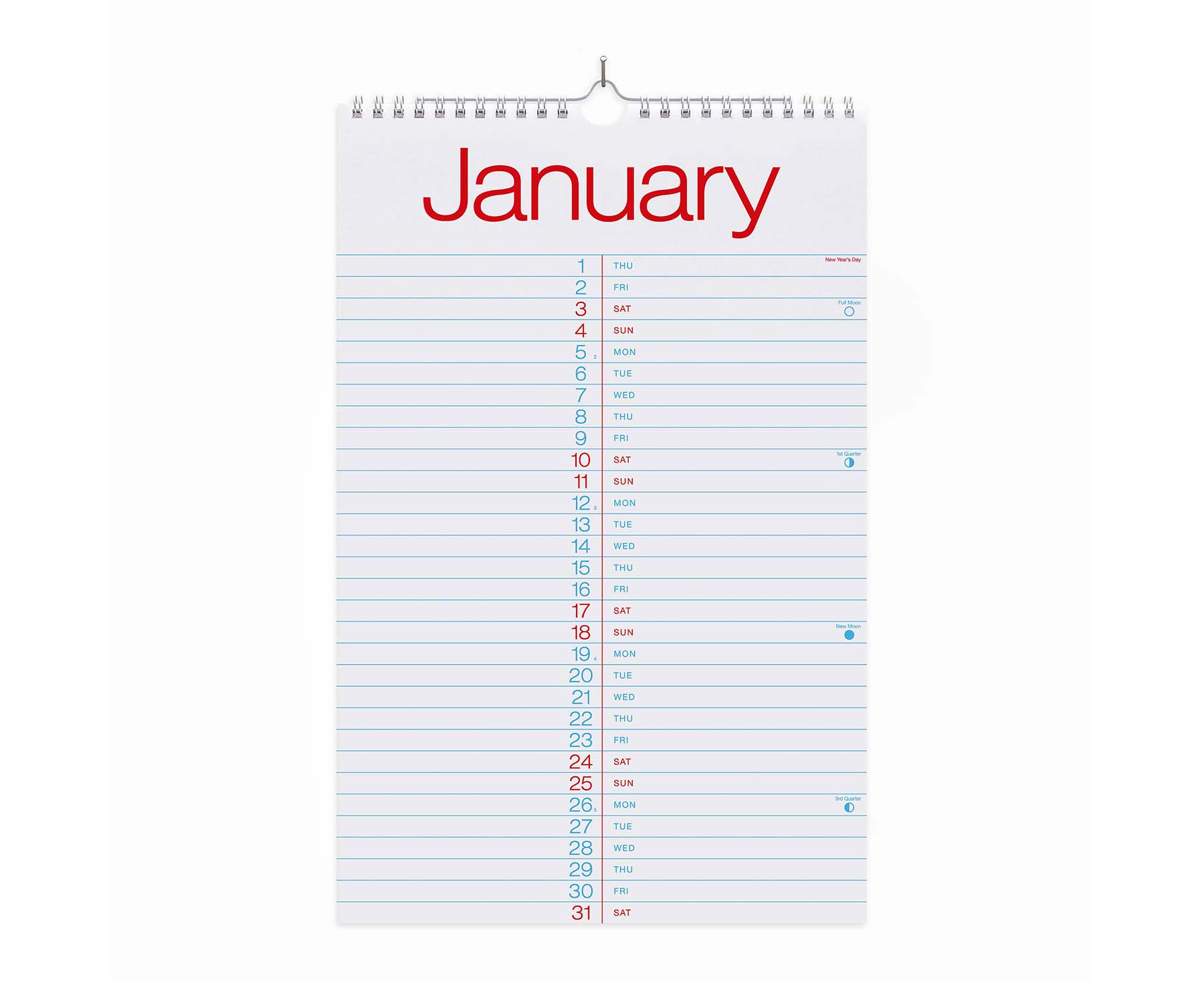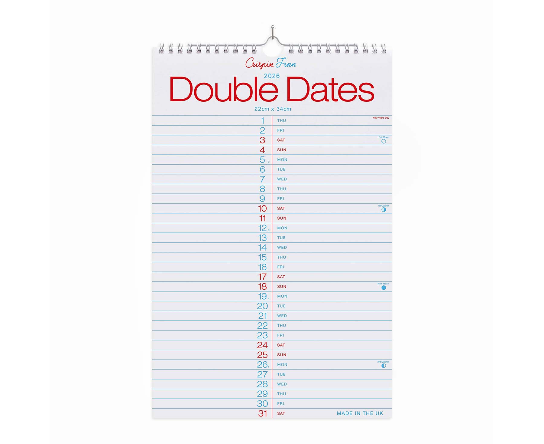 22cm x 34cm. Printed on 140gsm 100% sustainable FSC paper. Includes Bank Holidays, daylight time savings, lunar calendar and week No's. 13 pages (each month view plus a cover sheet), wirobound and designed to hang from a nail or pin. Made in the UK. Presented in protective, wrap around glassine sleeve packaging.