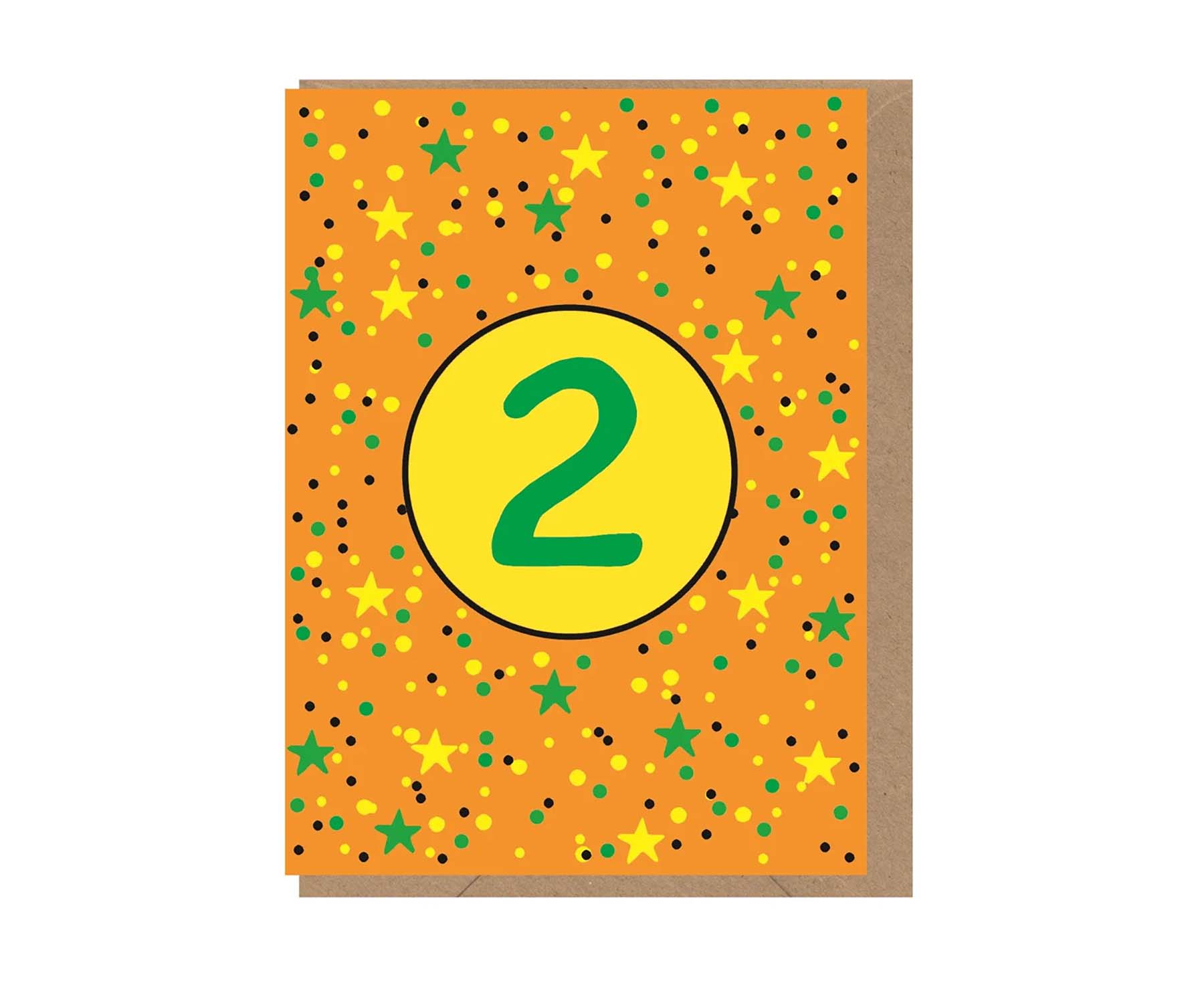 Part of Earlybird's fabulous range of neon mini cards with glorious embossing and spot UV, this mini second birthday card is covered in spots and stars and a number 2!