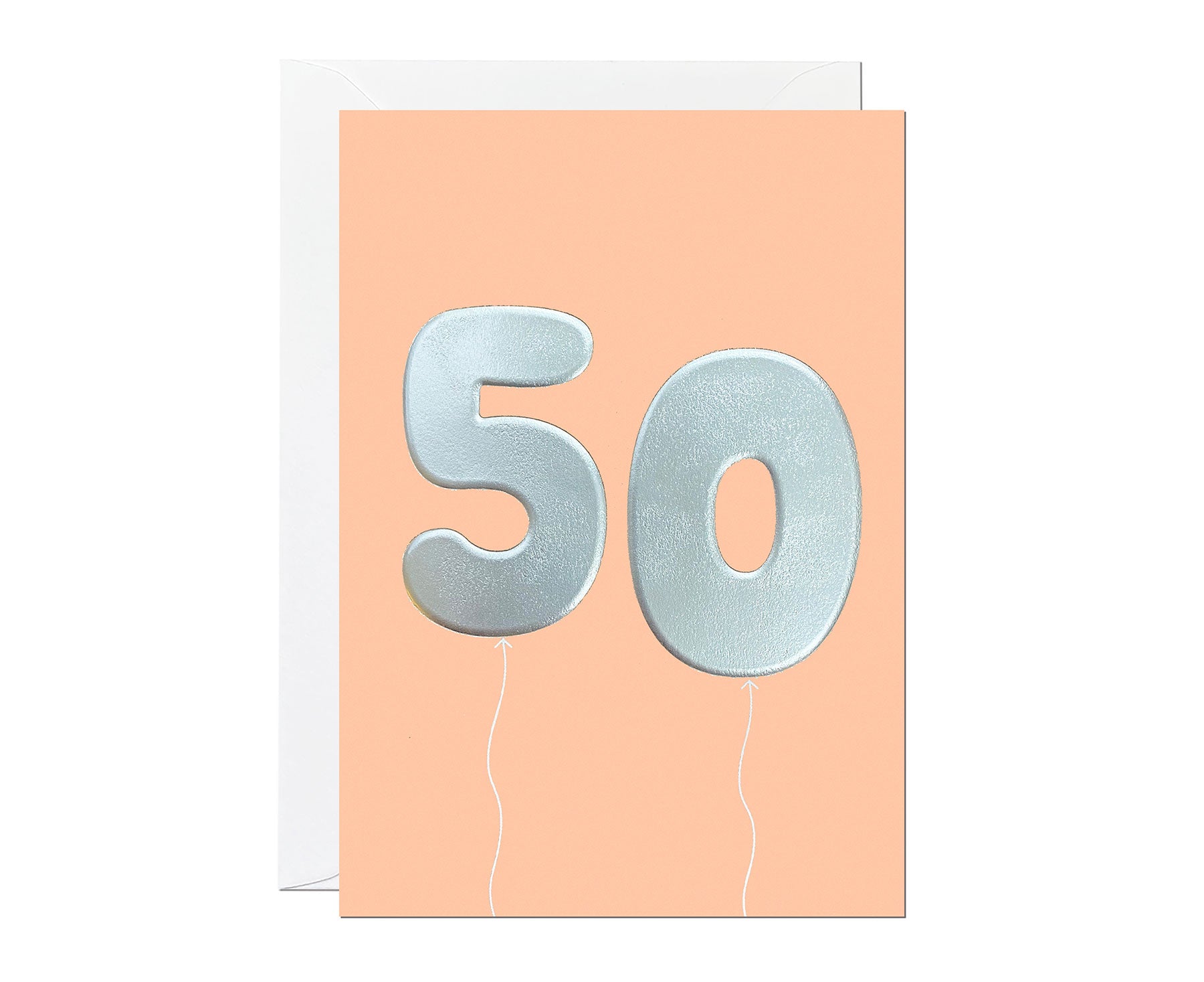 All the impact of those big helium balloon numbers without the awkwardness of carrying them from the shop! Printed on high quality sustainable GF Smith card, this silver embossed 50th card is one of the playful designs from the talented Ricicle Cards.