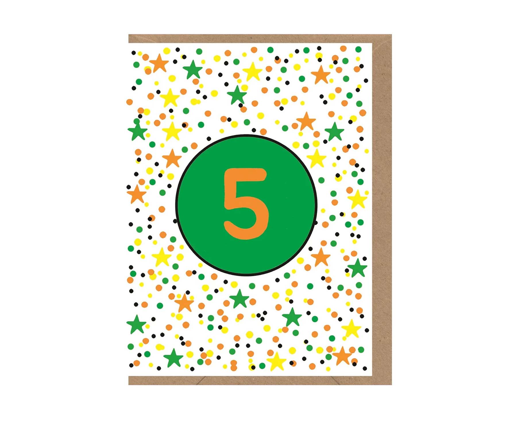 Part of Earlybird's fabulous range of neon mini cards with glorious embossing and spot UV, this mini fifth birthday card is covered in spots and stars and a number 5!