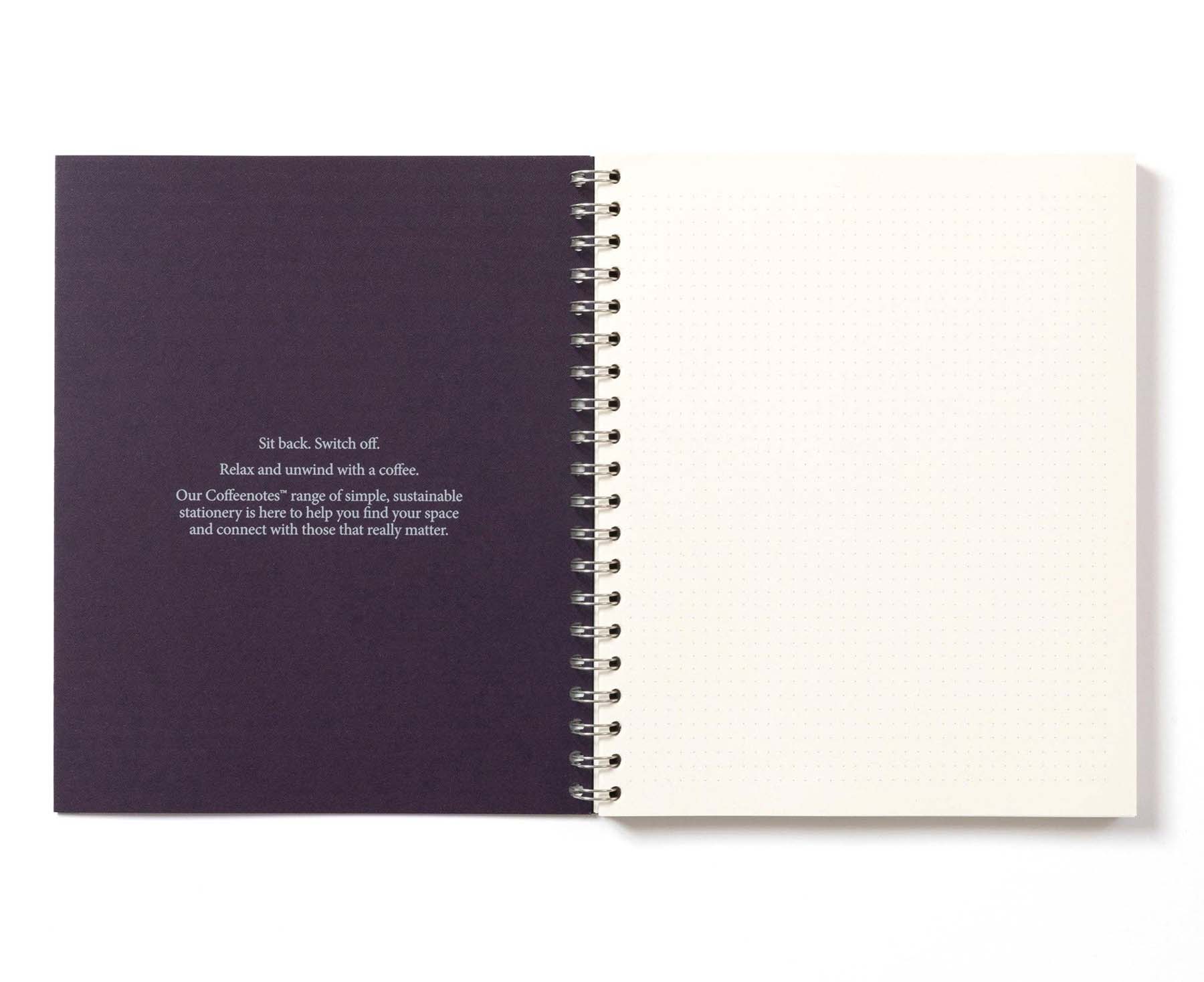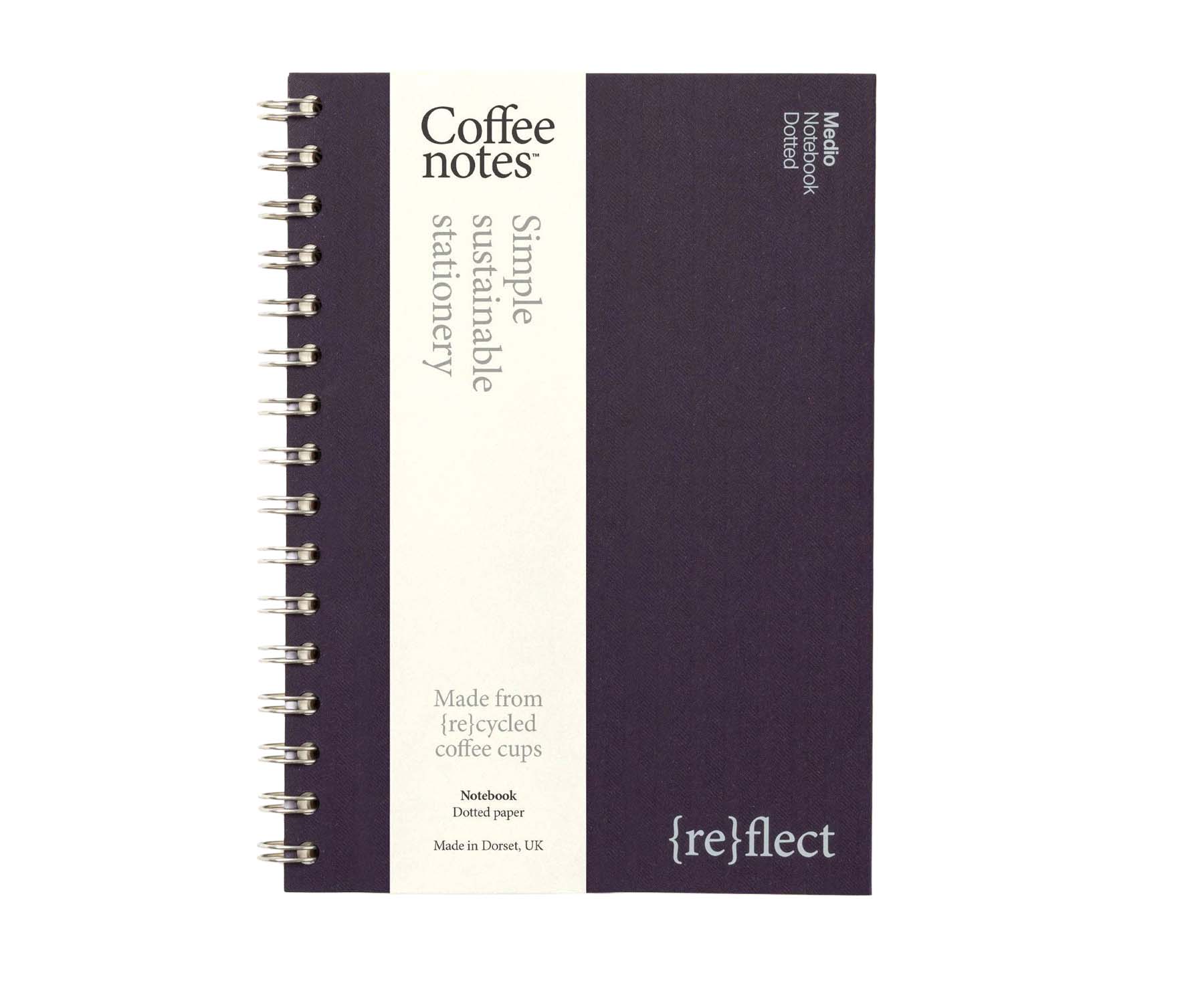 A5 (148mm x 210mm) wirebound notebook. 300gsm cover made from 20% cotton fibres, 20% natural textile fibres, 60% virgin fibre, 160 dotted inner pages 106gsm, made up of upcycled coffee cups, waste from coffee cup manufacture and virgin fibres.