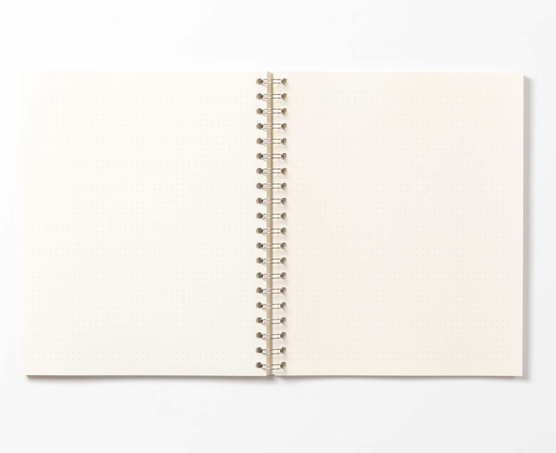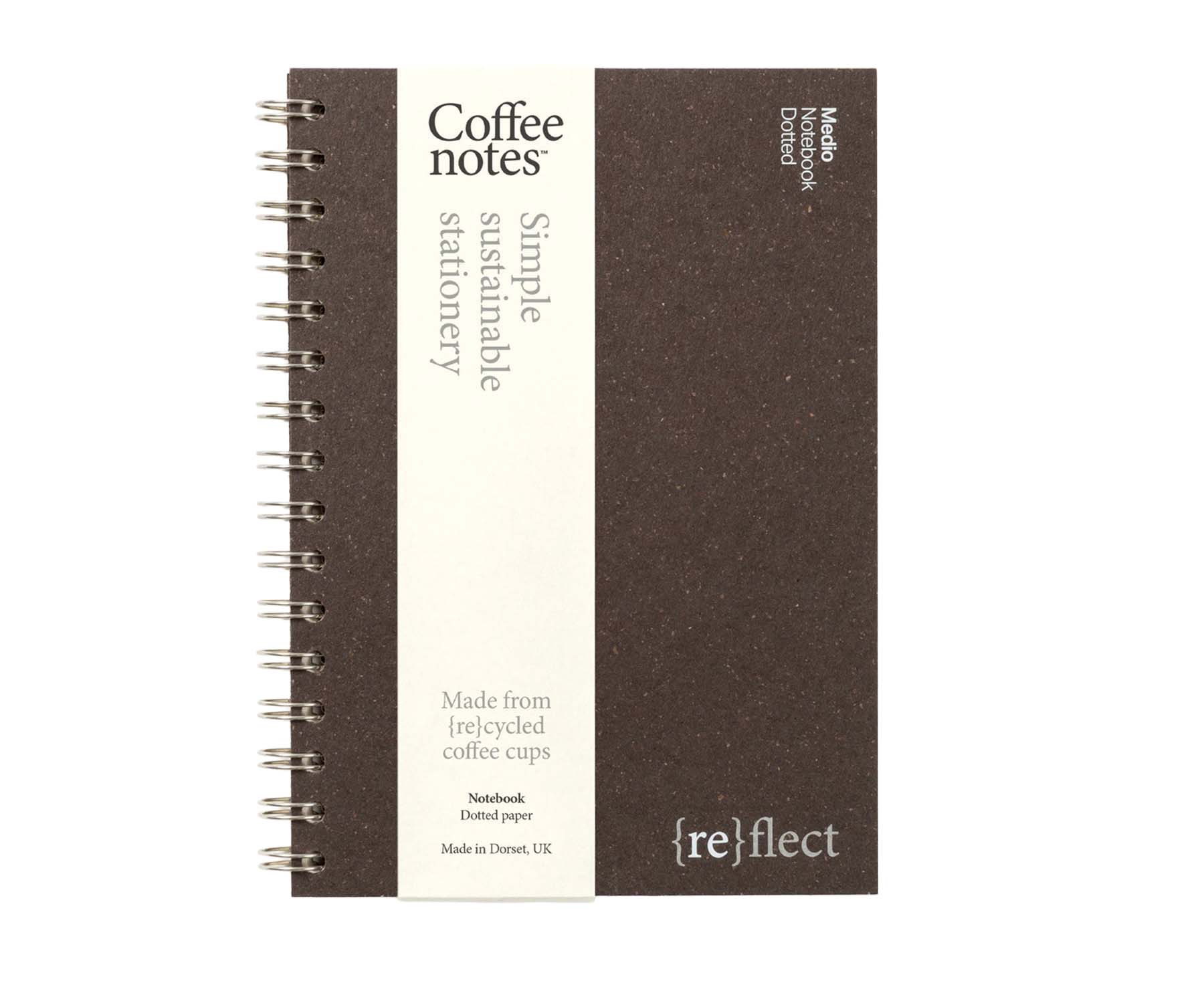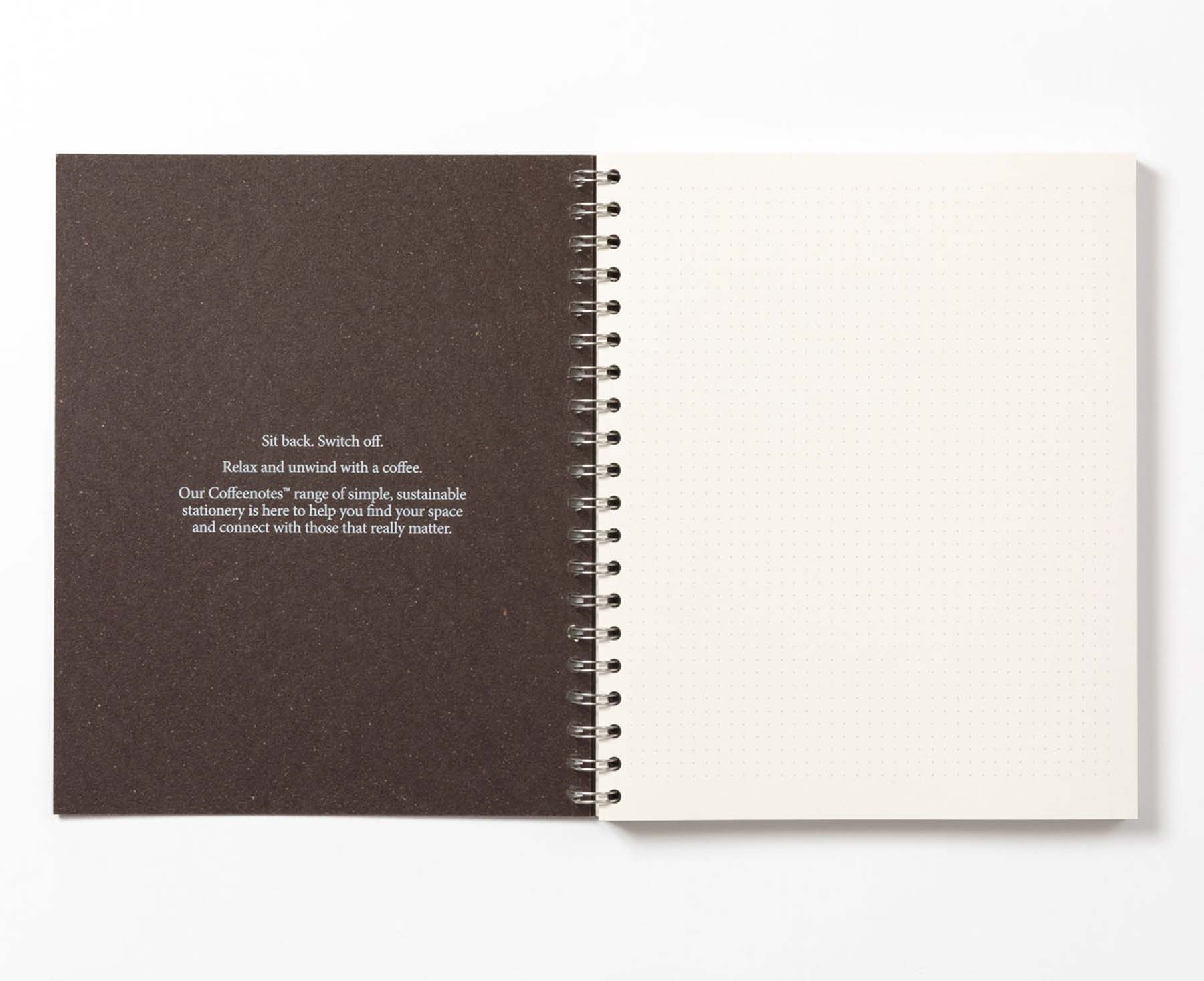 A5 (148mm x 210mm) wirebound notebook. 320gsm cover made up of 50-70% fibre from spent brewer's grain, 30-50% virgin fibre, 160 inner pages 106gsm, made up of upcycled coffee cups, waste from coffee cup manufacture and virgin fibres.