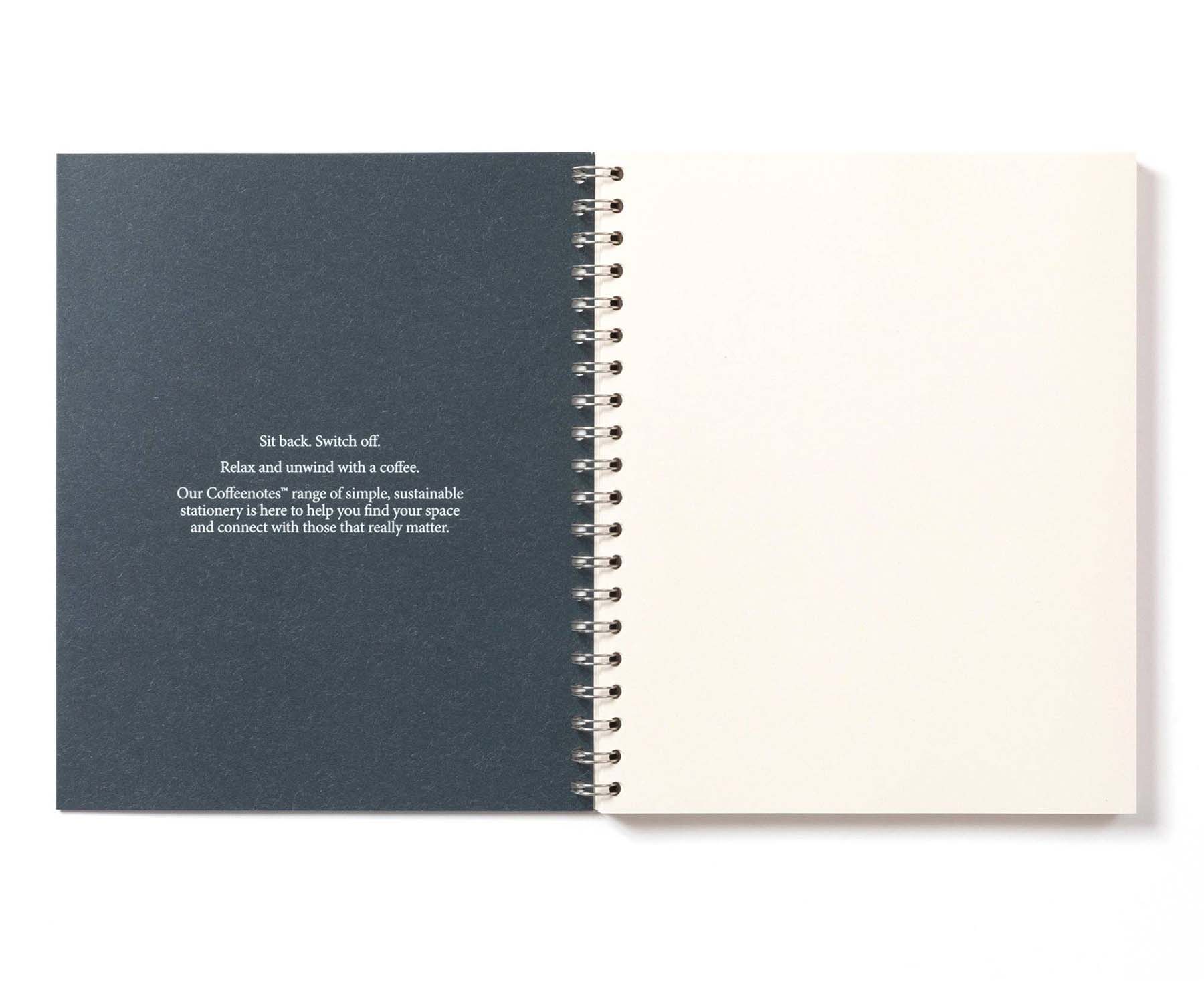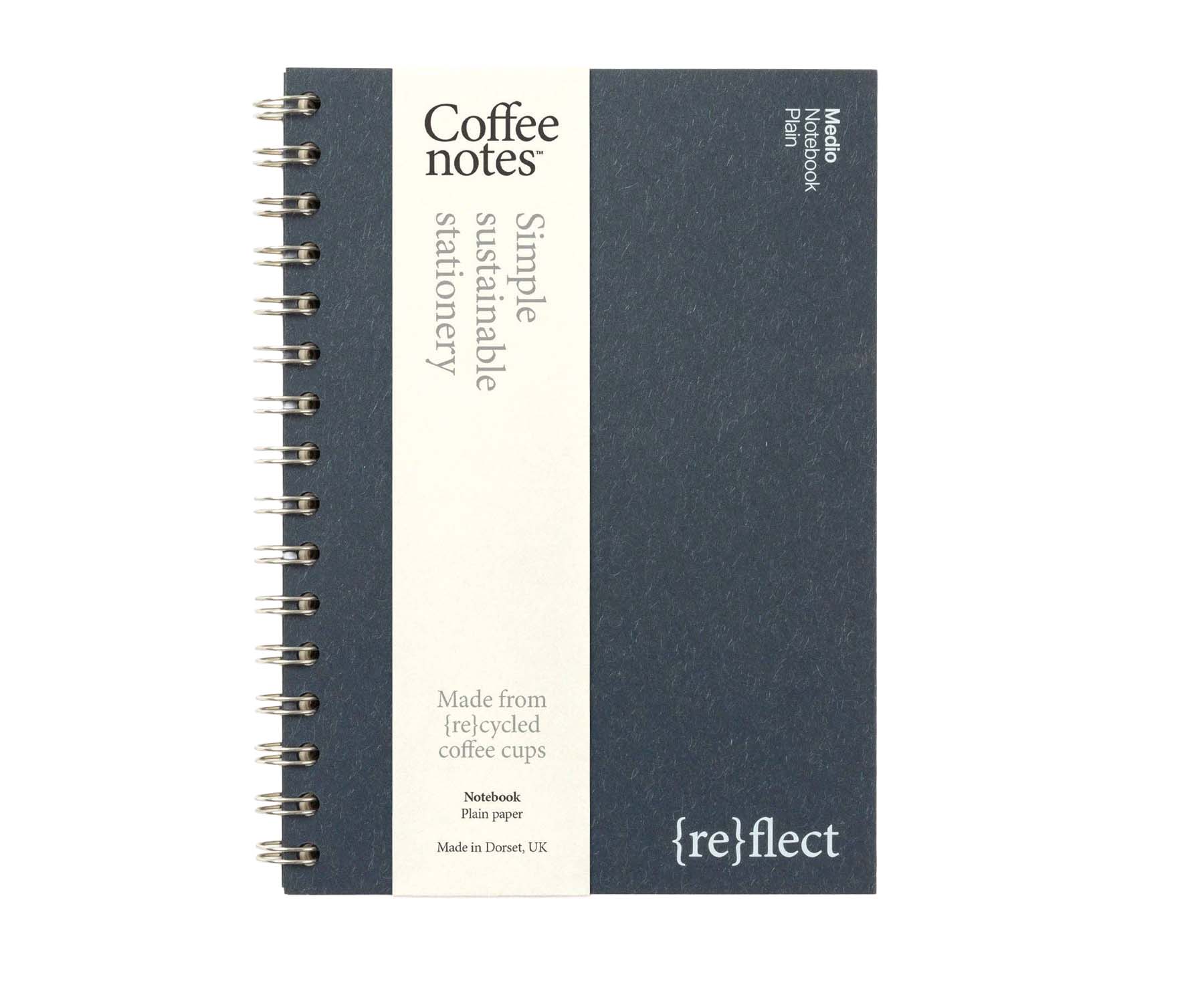 A5 (148mm x 210mm) wirebound notebook. 250gsm cover made from 40% post consumer waste recycled, 15% wool fibre residues, 45% virgin fibre, 160 plain inner pages 106gsm, made up of upcycled coffee cups, waste from coffee cup manufacture and virgin fibres.