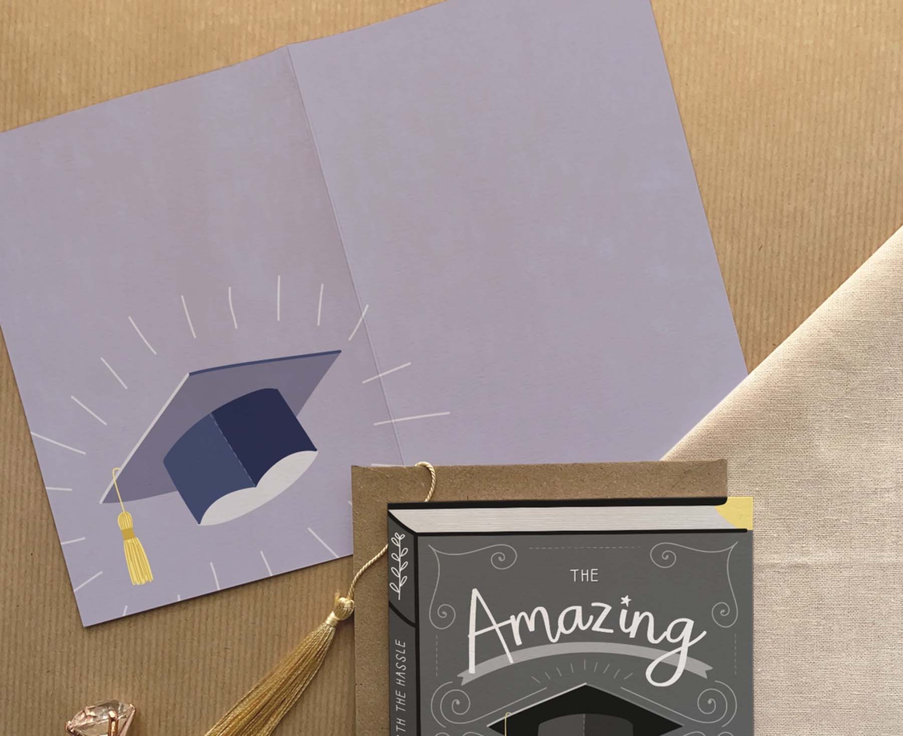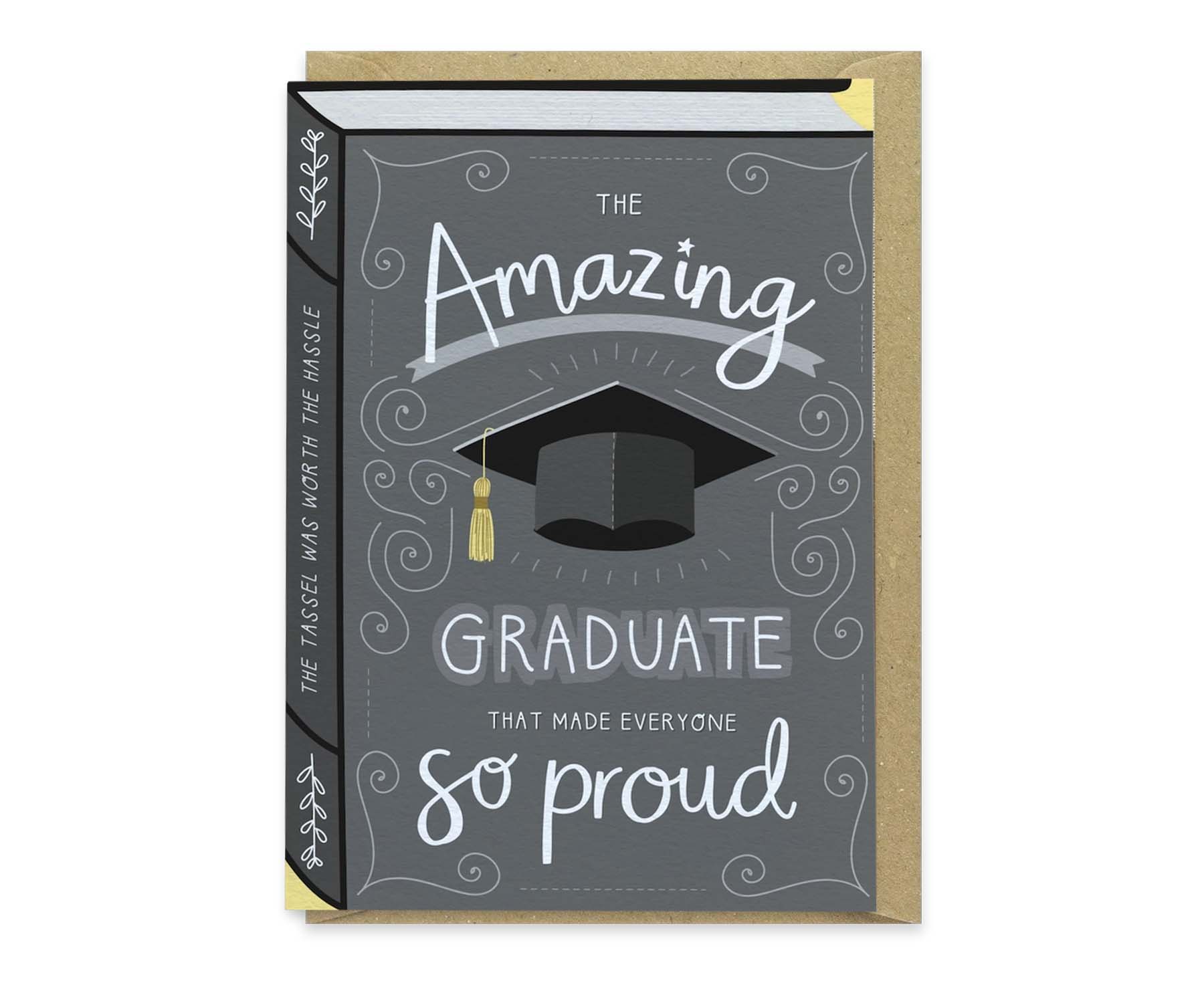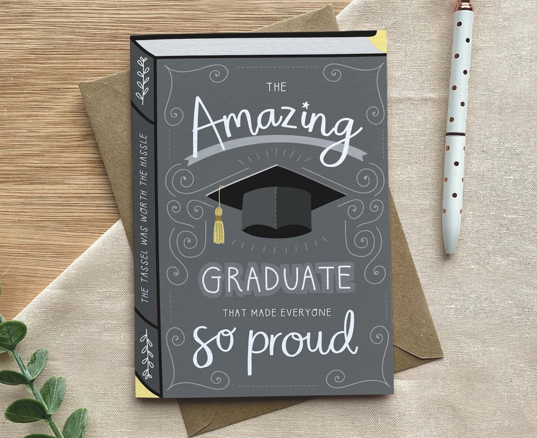 Inspired by classic book covers, this beautifully illustrated graduation card features a mortar board design with hand lettering that says 'The Amazing Graduate That Made Everyone So Proud' with an additional message on the spine - 'the tassel was worth the hassle' There's a gorgeous complementary mortar board design printed on the inside. It's one of many book inspired designs by Two for Joy Illustration.