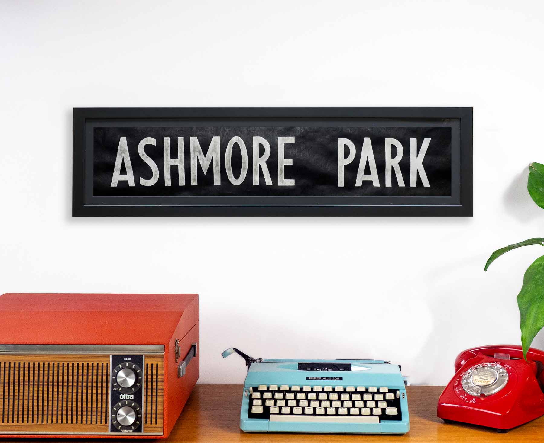 Ashmore Park is a large estate in the Wednesfield area of Wolverhampton. This Ashmore Park bus blind comes from the upper blind used on a Wolverhampton bus in the 1980s.
