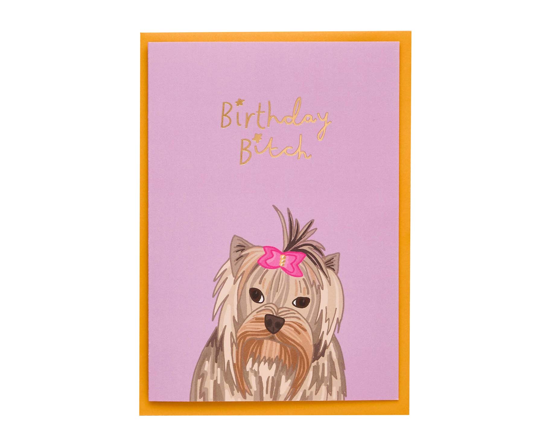Featuring the most pouting pooch you'll ever see, this card is beautifully illustrated and features a hand written message in gold foil that reads 'Birthday Bitch.' It comes with a coordinating butterscotch envelope.
