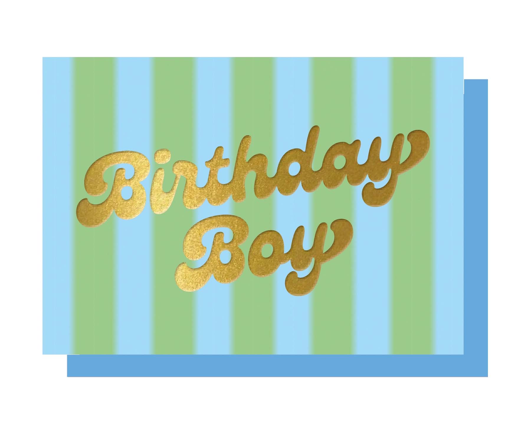 This birthday card from Lucky Ink is as bright as they come with vertical hazy pale blue and green striped background and 'Birthday Boy' type handprinted in gold foil.