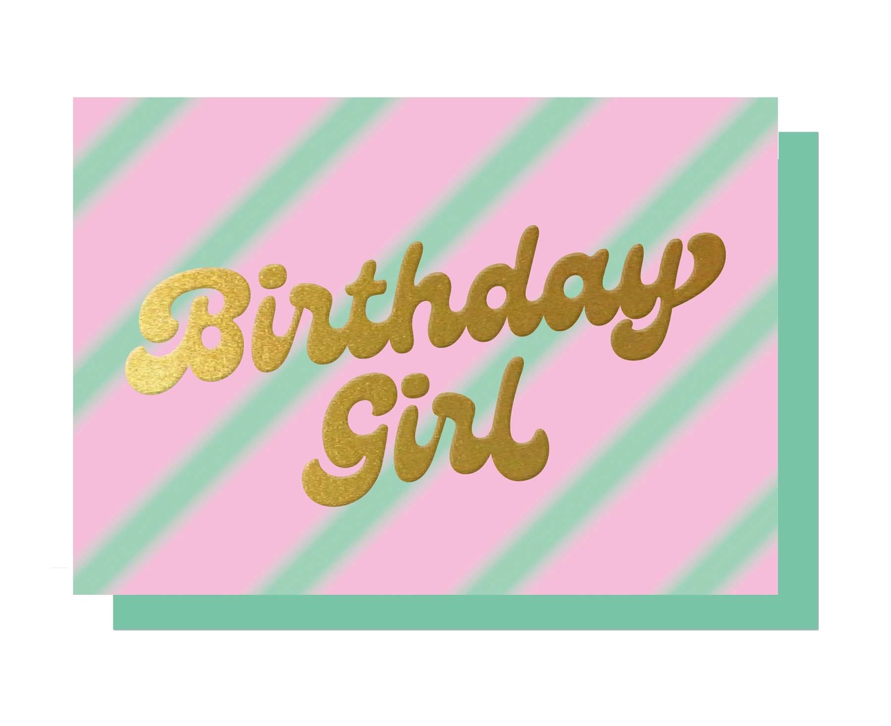 This birthday card from Lucky Ink is as bright as they come with a diagonal hazy pink and mint green striped background and 'Birthday Girl' type handprinted in gold foil.