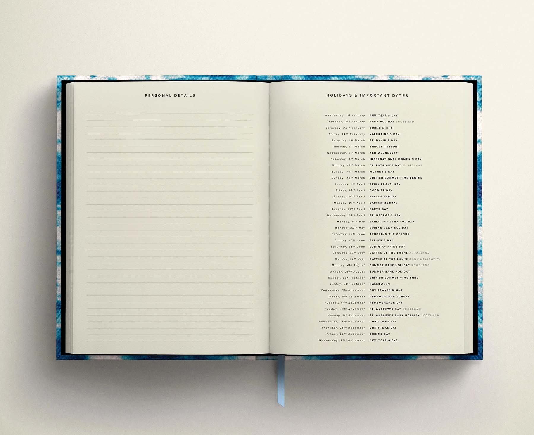 215mm x 152mm A5 case bound layflat 2025 diary, fabric cover with gold foil detail, 120gsm off white pages and matching ribbon bookmark. Printed and hand made in Brighton, UK.