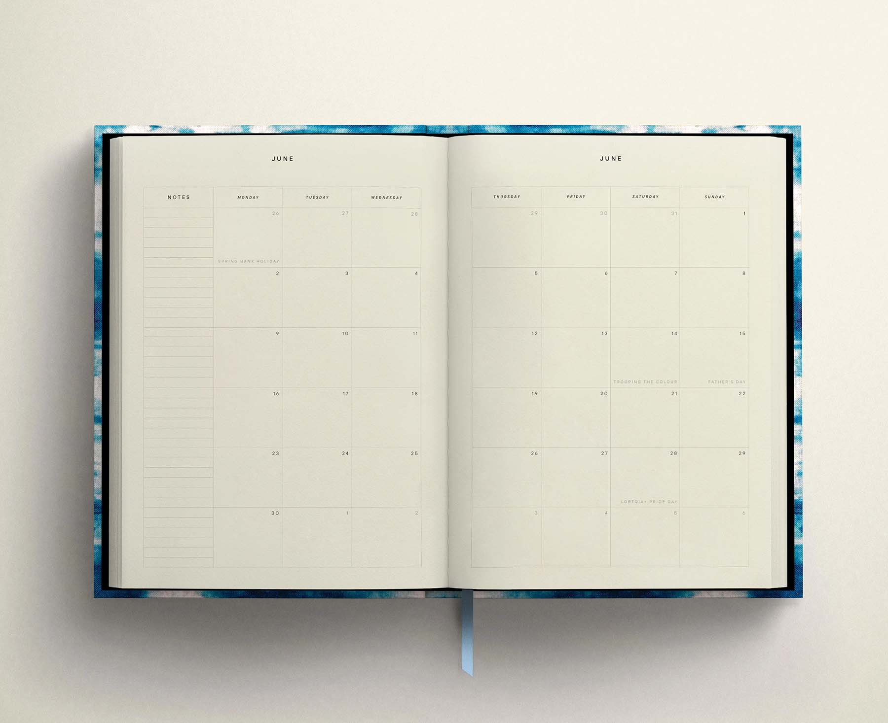 With its bleached blue fabric cover and gold foil detail, this beautiful 2026 diary is a gorgeous tactile thing. It has lay flat binding and luxurious 120gsm off white pages, each month has a double page spread followed by a page per week with space for notes, lists and important info on the opposite page. Printed and hand made in Brighton by 1973.