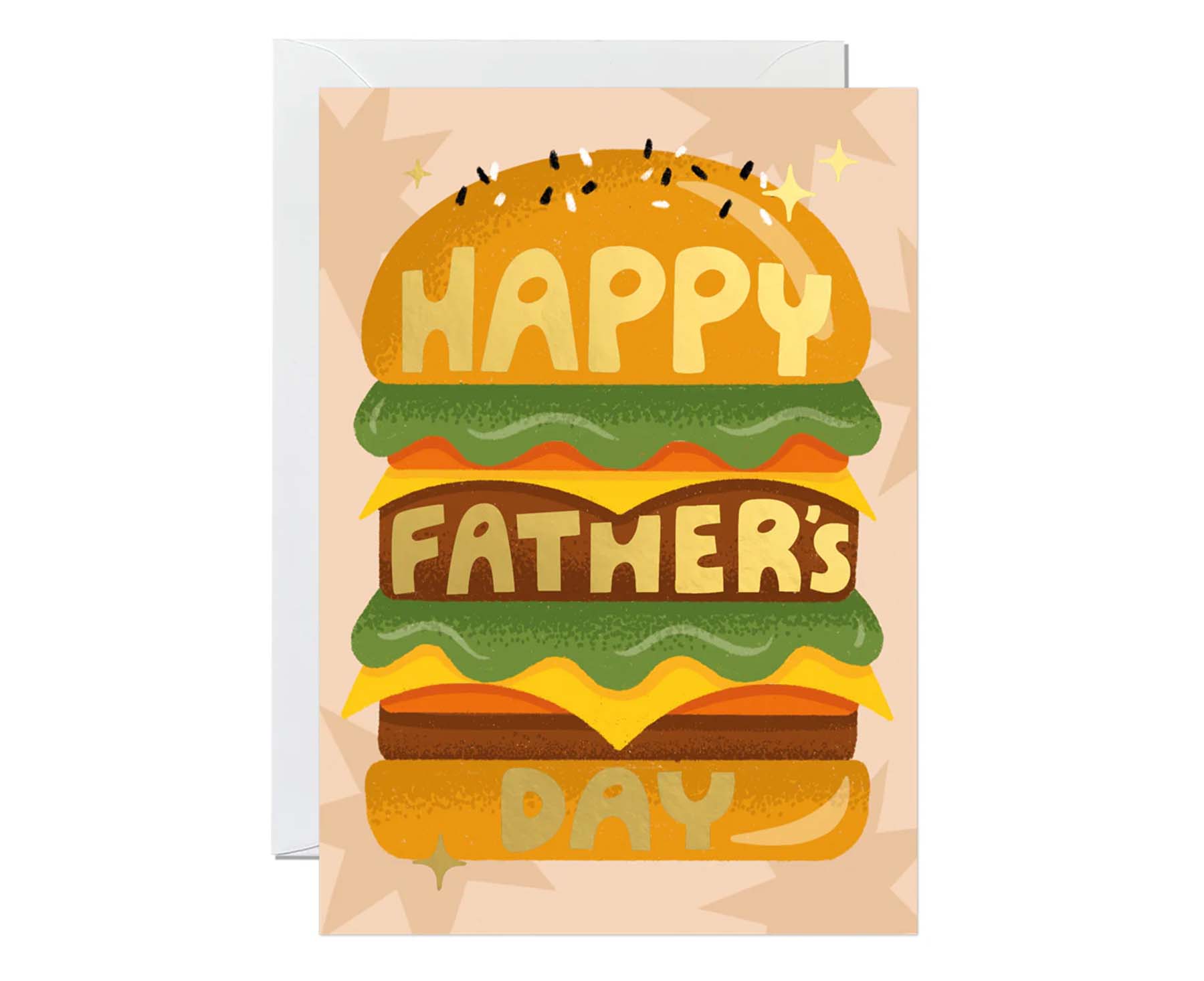 This beautifully illustrated father's day card features the biggest juiciest looking burger that your Dad has ever seen, along with gorgeous 'Happy Father's Day' text in a sumptuous matt gold foil. It's part of a collaboration with illustrator Megan Roy and as with all Ricicle Cards is printed sustainably on FSC certified card stock.