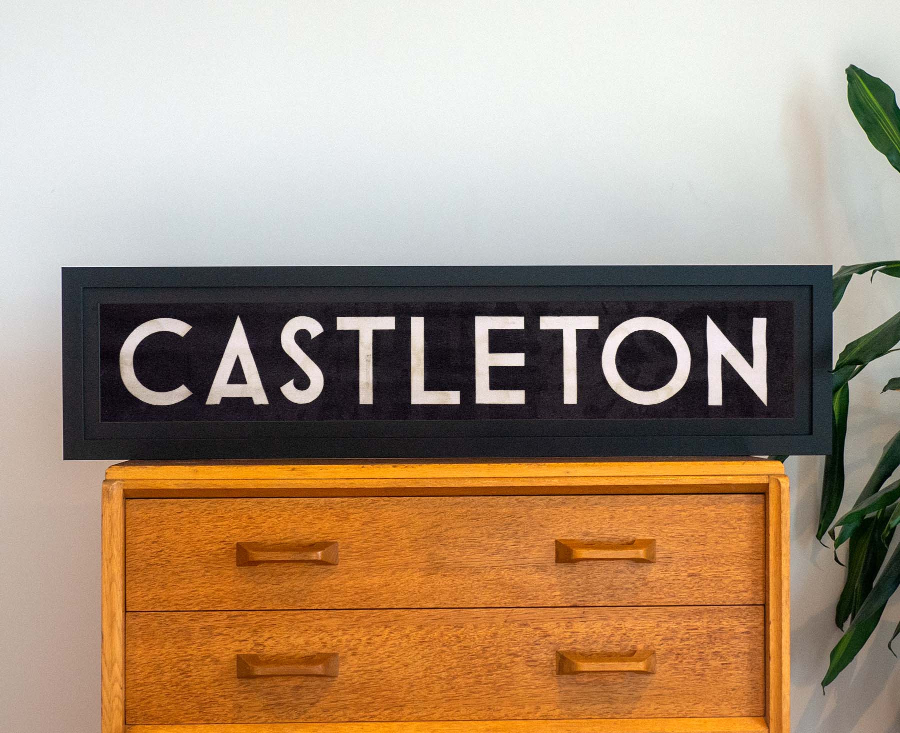 Castleton is a village in the High Peak district of Derbyshire. It is extremely popular with visitors to its caverns and nearby Mam Tor. Produced in 1971, this Castleton bus blind comes from a Sheffield bus route and is quite sizeable at almost a metre wide. As an original vintage item, it may show signs of its age, such as discolouration and other marks, but we think this just makes it even more attractive.