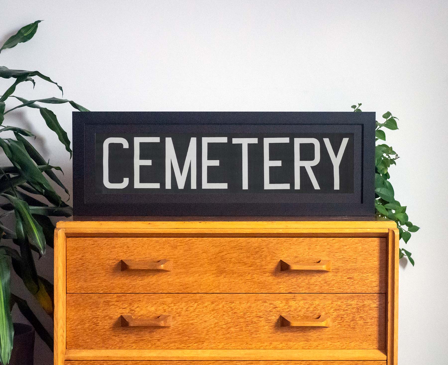This came from a Cumbria bus route based out of Grange-over-Sands so could refer to any number of cemeteries within the local area.. Although undated, the style of the typeface and linen material means this bus blind most likely dates back to the 1960s. As a vintage item, it may show signs of its age, such as discolouration and other marks, but this just makes it even more attractive.