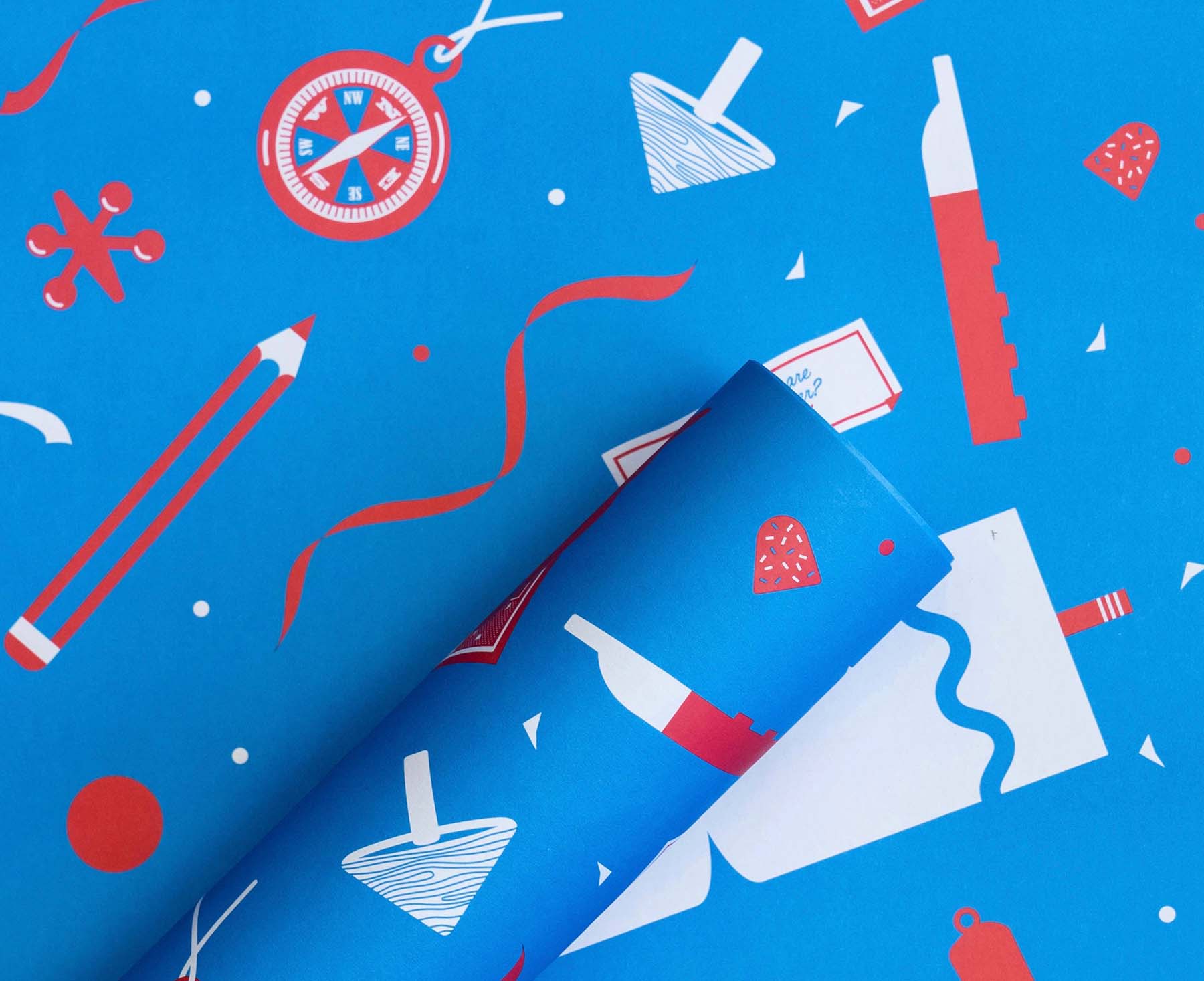 Featuring all your Christmas cracker favourites including a fortune telling fish, a spining top, a compass, a paperclip, a jumping frog, a whistle and more, this colourful wrapping paper from Crispin Finn is in their trademark red, white and blue and is made from 100% recycled and recyclable paper. Wrapping paper is sold as individual 50cm x 70cm sheets and will be supplied folded. It is sustainably printed in the UK.
