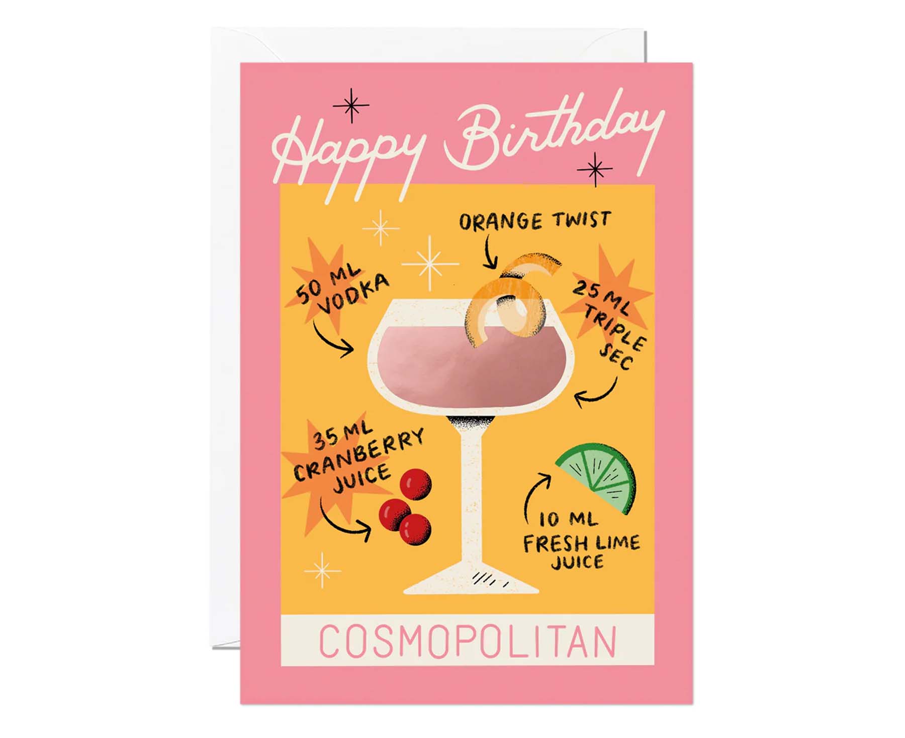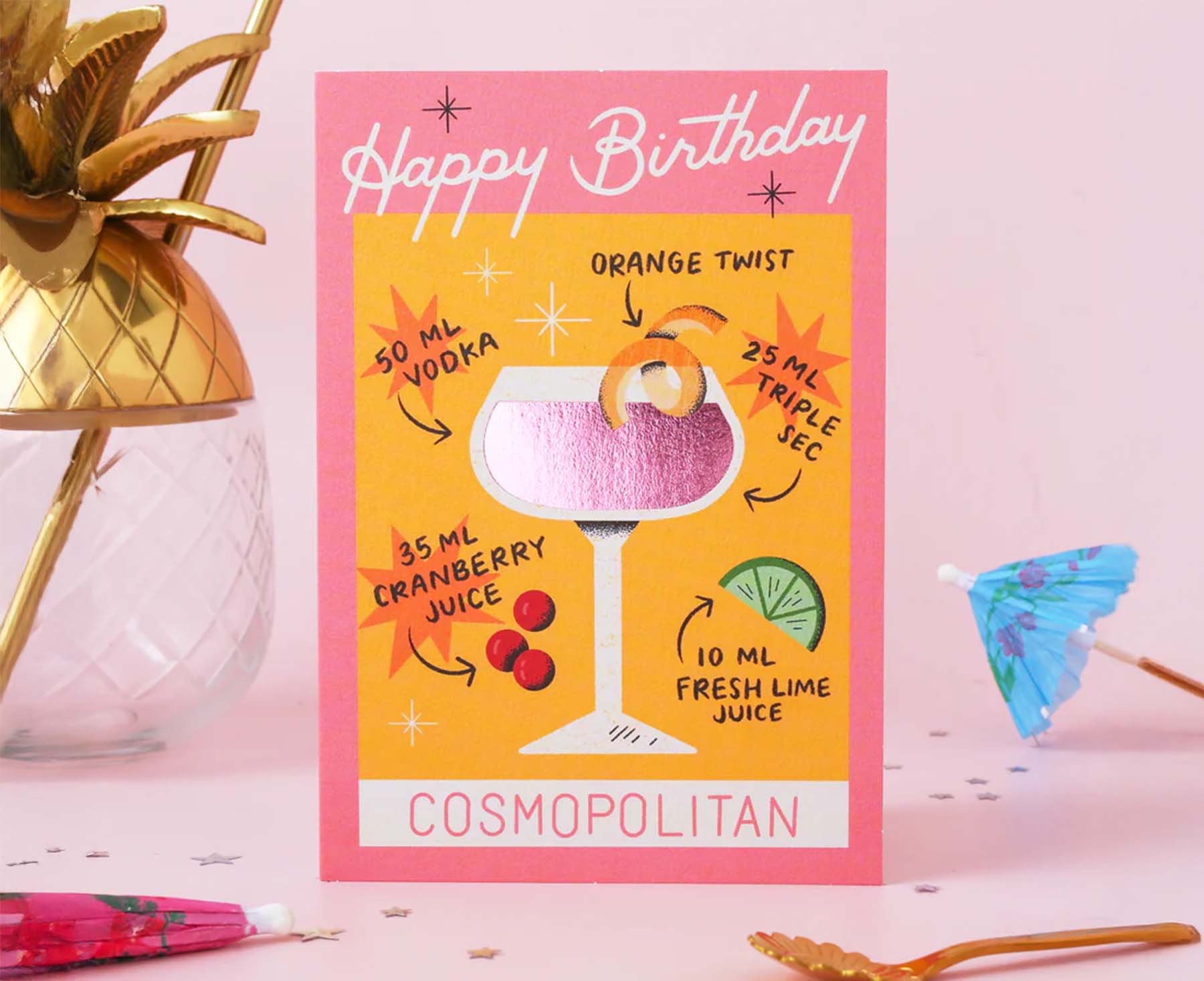 One of a range of foiled cocktail cards designed in collaboration with Megan Roy, this Cosmopolitan cocktail birthday card has perfect pink foiling and tells you all you need to make this classic cocktail. Like all Ricicle Cards it is printed in the UK on sustainable stock and comes with a suitably luxurious envelope.