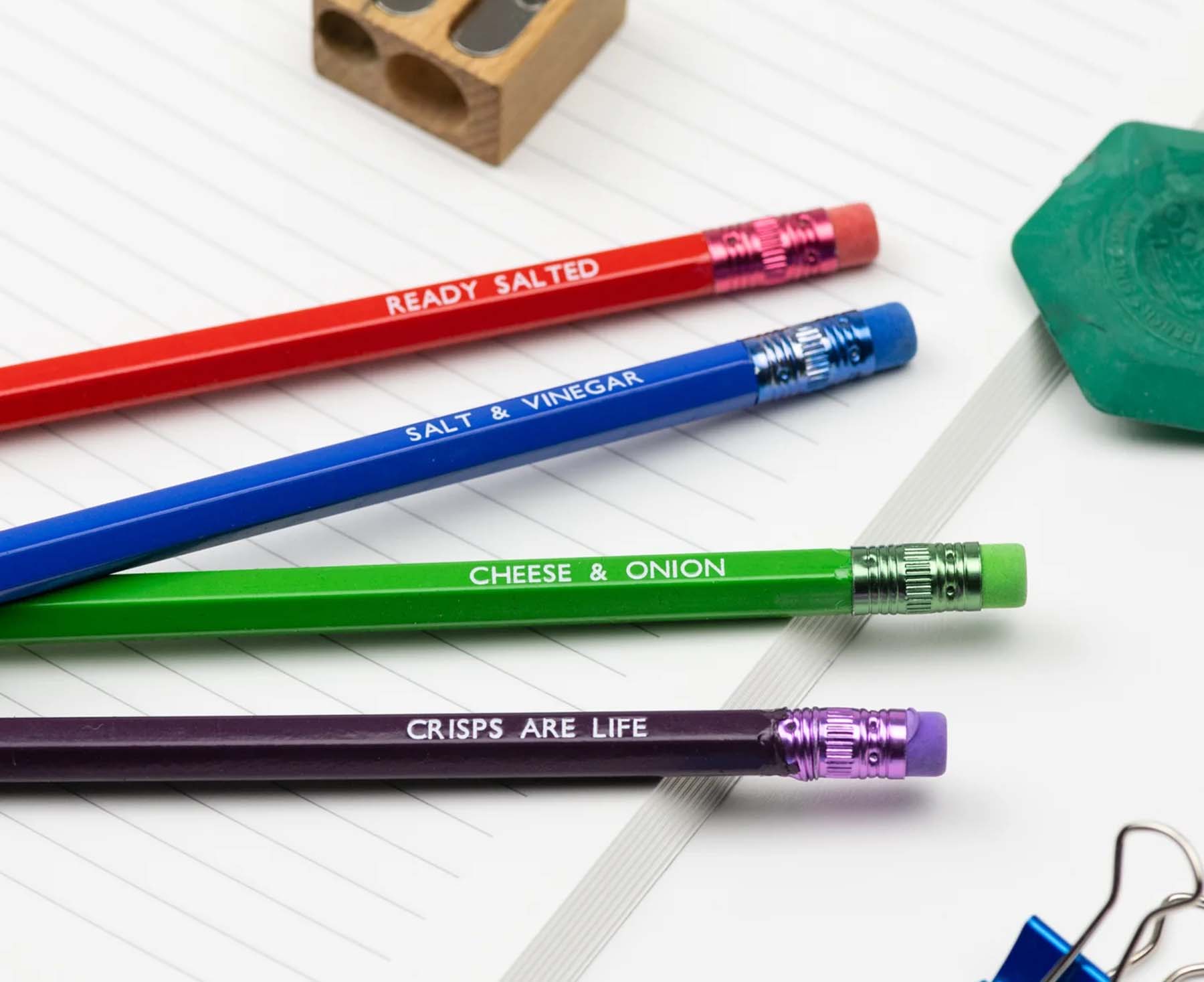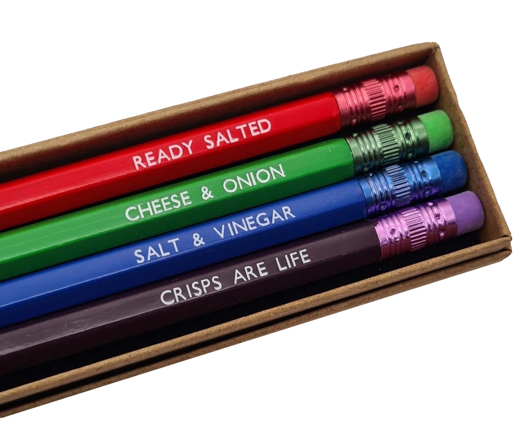 This set of four unsharpened 2B pencils with erasers in red, green, blue and purple is perfect for any lover of crisps, and who doesn't love Crisps? Each pencil has white foiled text that has been hand printed in Scotland. There's Ready Salted, Cheese & Onion, Salt & Vinegar and Crisps Are Life, all presented in a plain cardboard gift box.