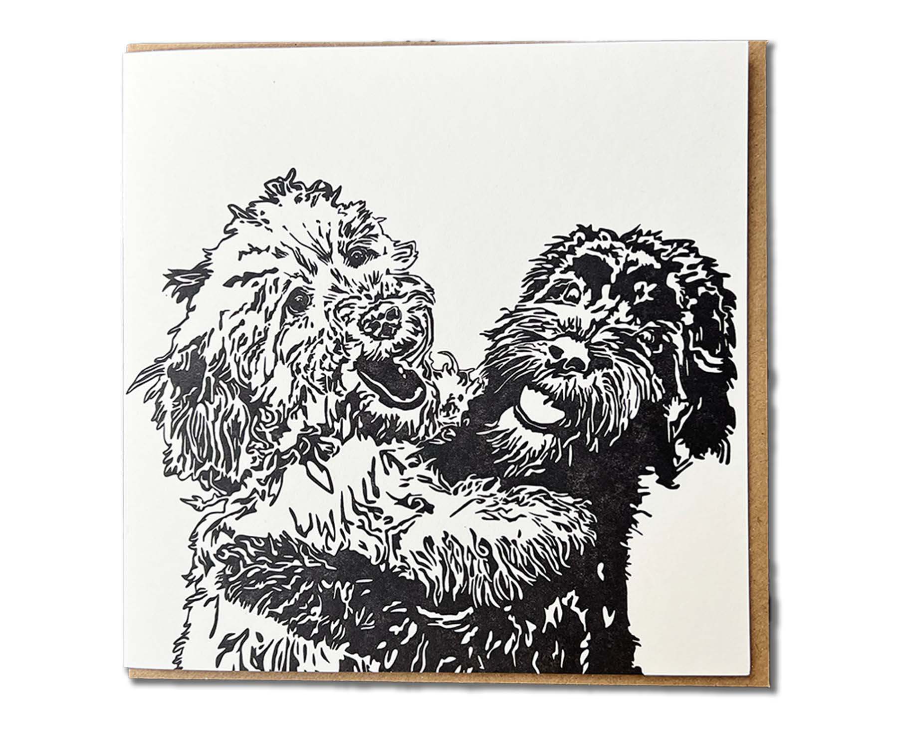 The most gorgeous pair of cuddling Cockapoos doing what they doing best - having fun! This card perfectly captures the loving playfulness of these gorgeous and unsurprisingly popular dogs. If the cuteness of two Cockapoo dogs is too much to handle, check out the individual Cockapoo card too. All Penguin Ink cards are Letterpress printed in England using a traditional Heidelberg press, giving them a tactile embossed finish on a thick textured card stock.