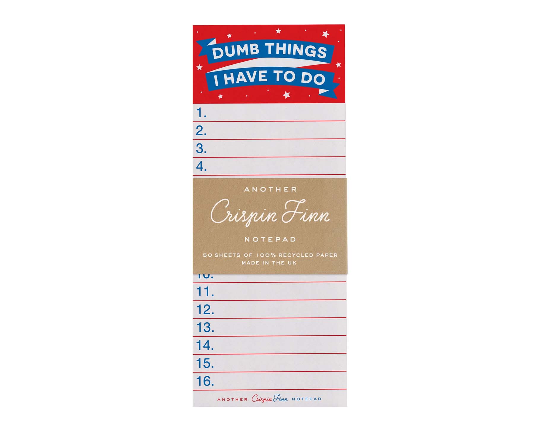 Adult life is essentially just a list of dumb things we have to do, so you might as well get those dumb things well organised with this pad! Part of Crispin Finn's fun notepad range, this playful pad is perfect for all your shopping lists, beautifully illustrated in their trademark red, white and blue style. There are 50 tear off pages printed on 100% recycled 120gsm paper.