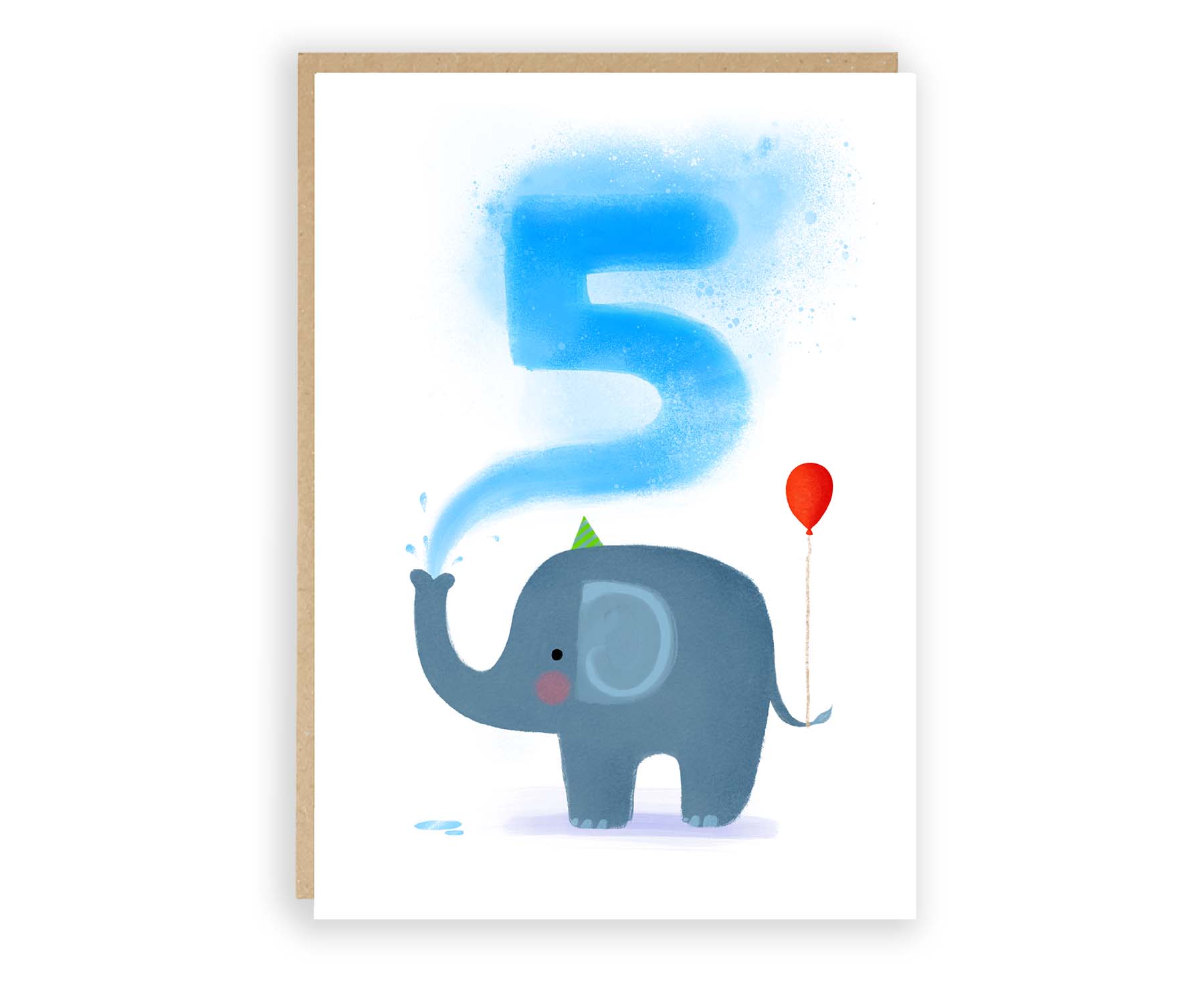 Part of a range of cards designed by Jade Fisher's brother Adam, this beautifully illustrated elephant fifth birthday card is the perfect way to spray happy birthday to any five year old!