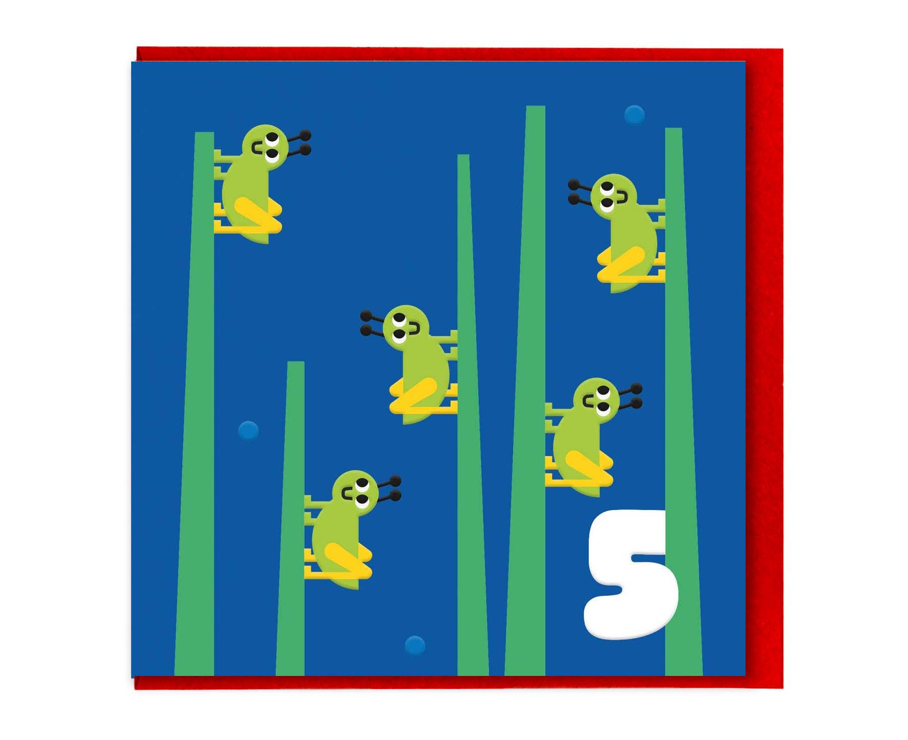 Part of a series of kids' bug themed age cards from Studio Boketto, this colourful fifth birthday card features five cute little grasshoppers on grass stalks. The embossing on this range is some of the best use of embossing I've ever seen and it really brings these grasshoppers to life!