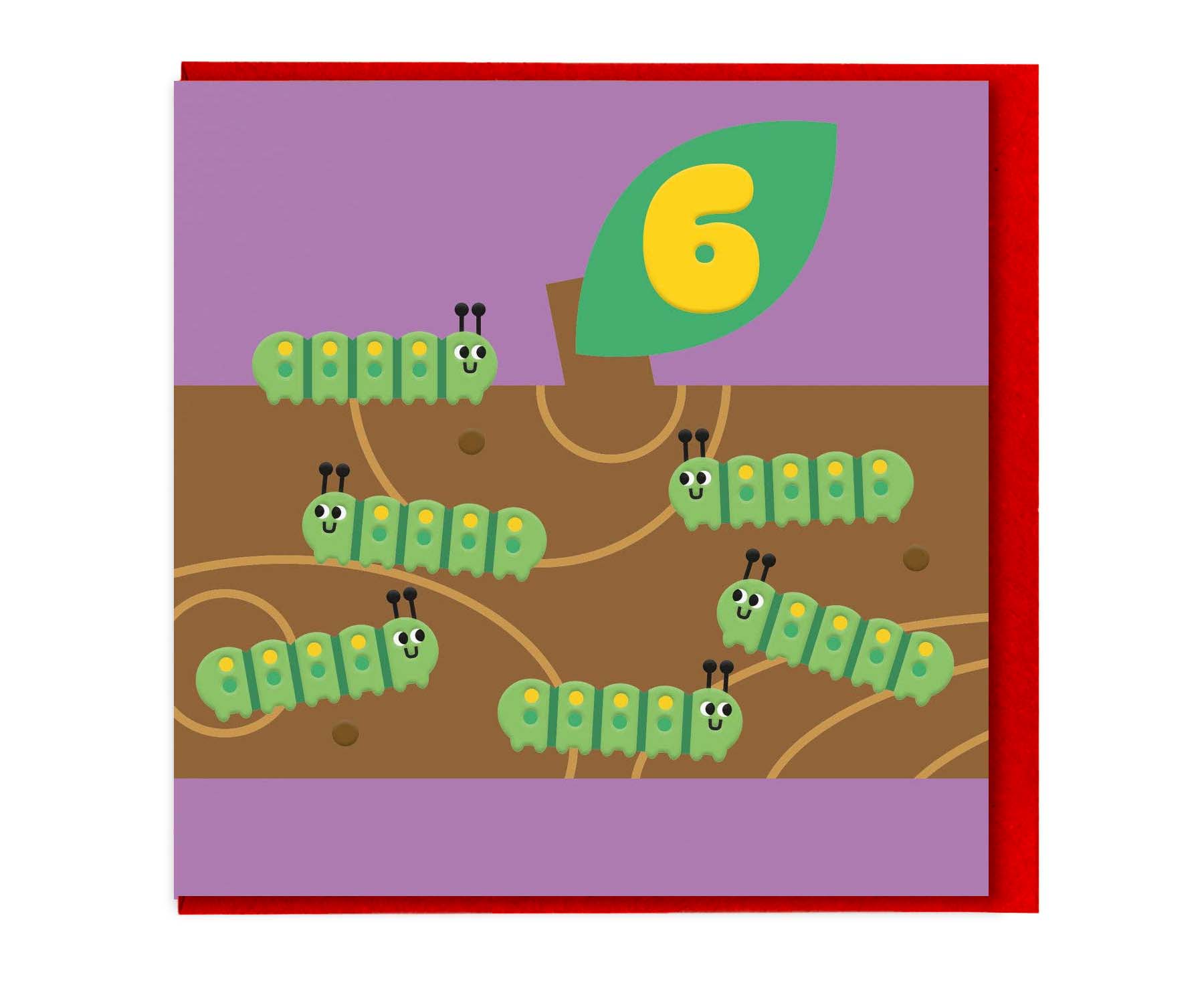 Part of a series of kids' bug themed age cards from Studio Boketto, this colourful sixth birthday card features six little green caterpillars on a tree branch with a number 6 leaf. The embossing on this range is some of the best use of embossing I've ever seen and it really brings these caterpillars to life!