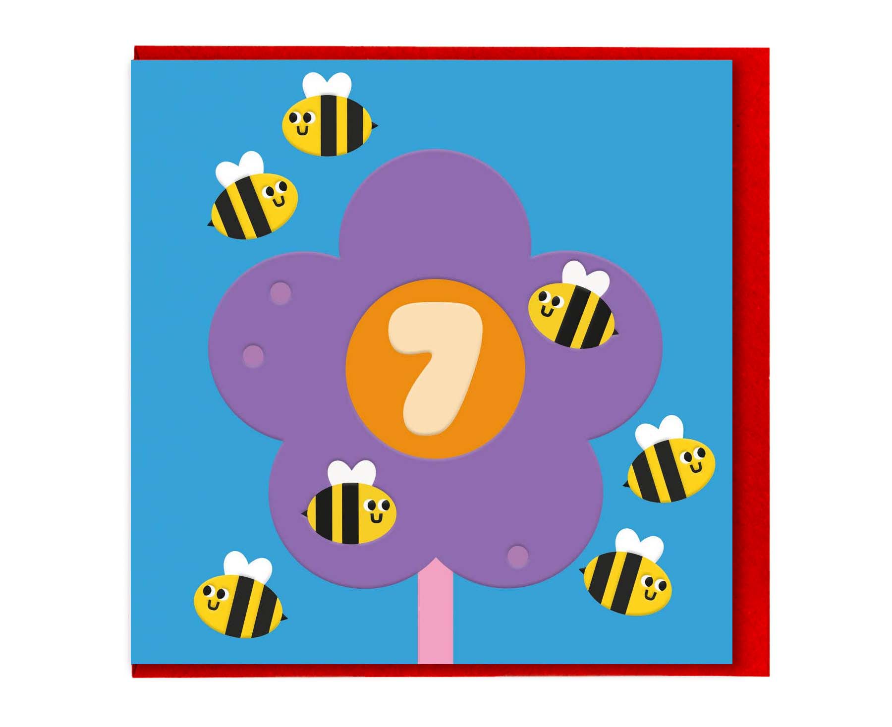 Part of a series of kids' bug themed age cards from Studio Boketto, this colourful seventh birthday card features seven cute little bumble bees buzzing around a number 7 flower. The embossing on this range is some of the best use of embossing I've ever seen and it really brings the little bees to life!