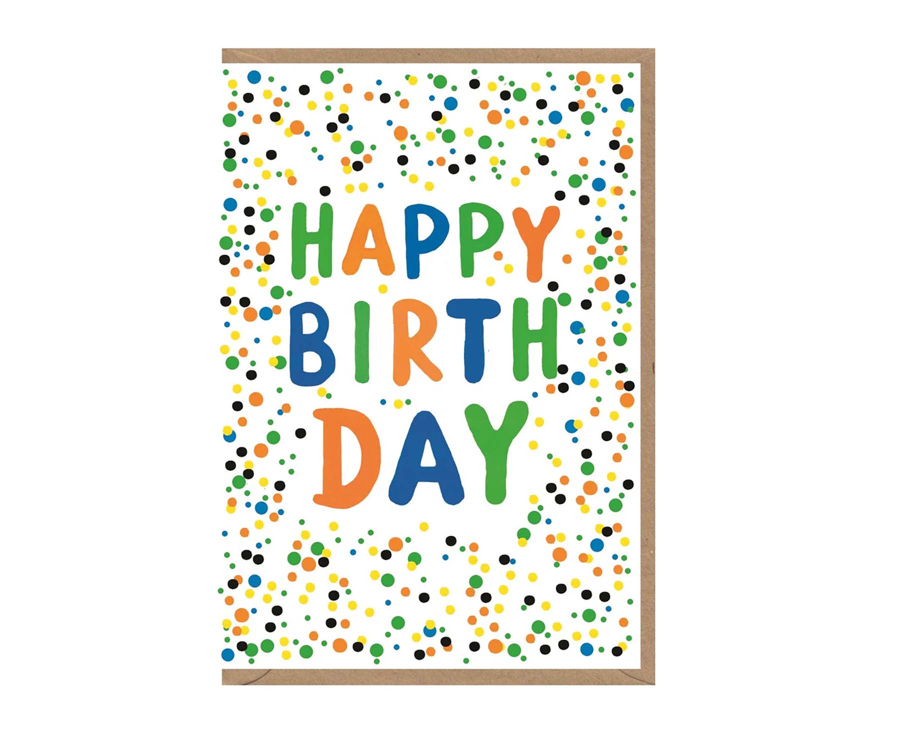 Featuring Earlybird's signature neon colours, glorious embossing and spot UV finish, this birthday card is bursting with a multitude of multi-coloured dots.