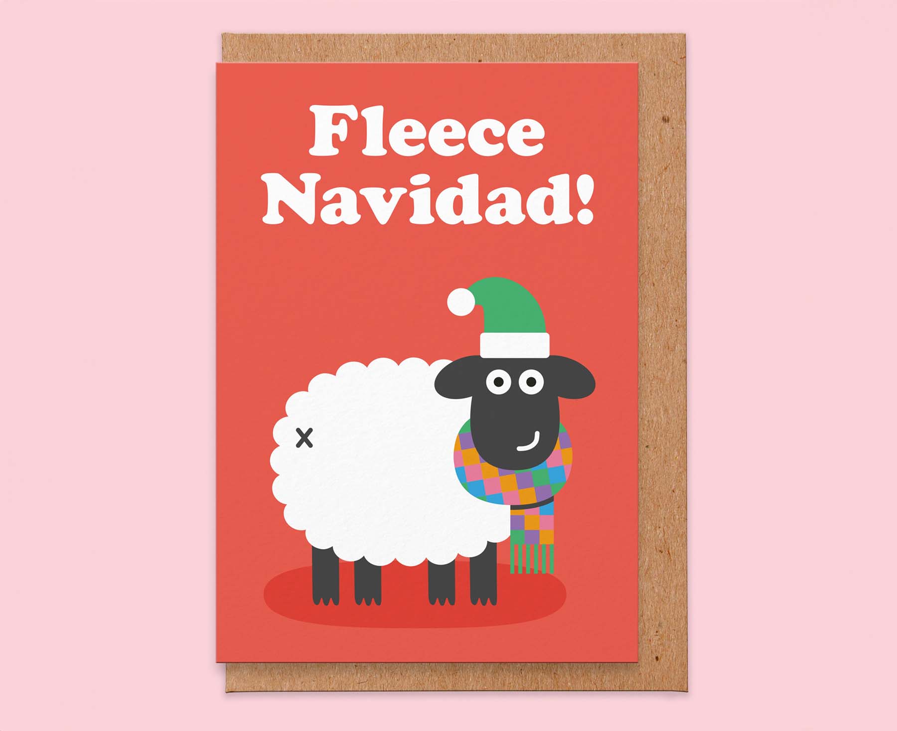 Perfect for Spanish speaking sheep fans, or just anyone who loves a fun festive pun, this sheepish 'Fleece Navidad!' illustrated Christmas card from Studio Boketto features the cutest scarf clad sheep you'll ever see!