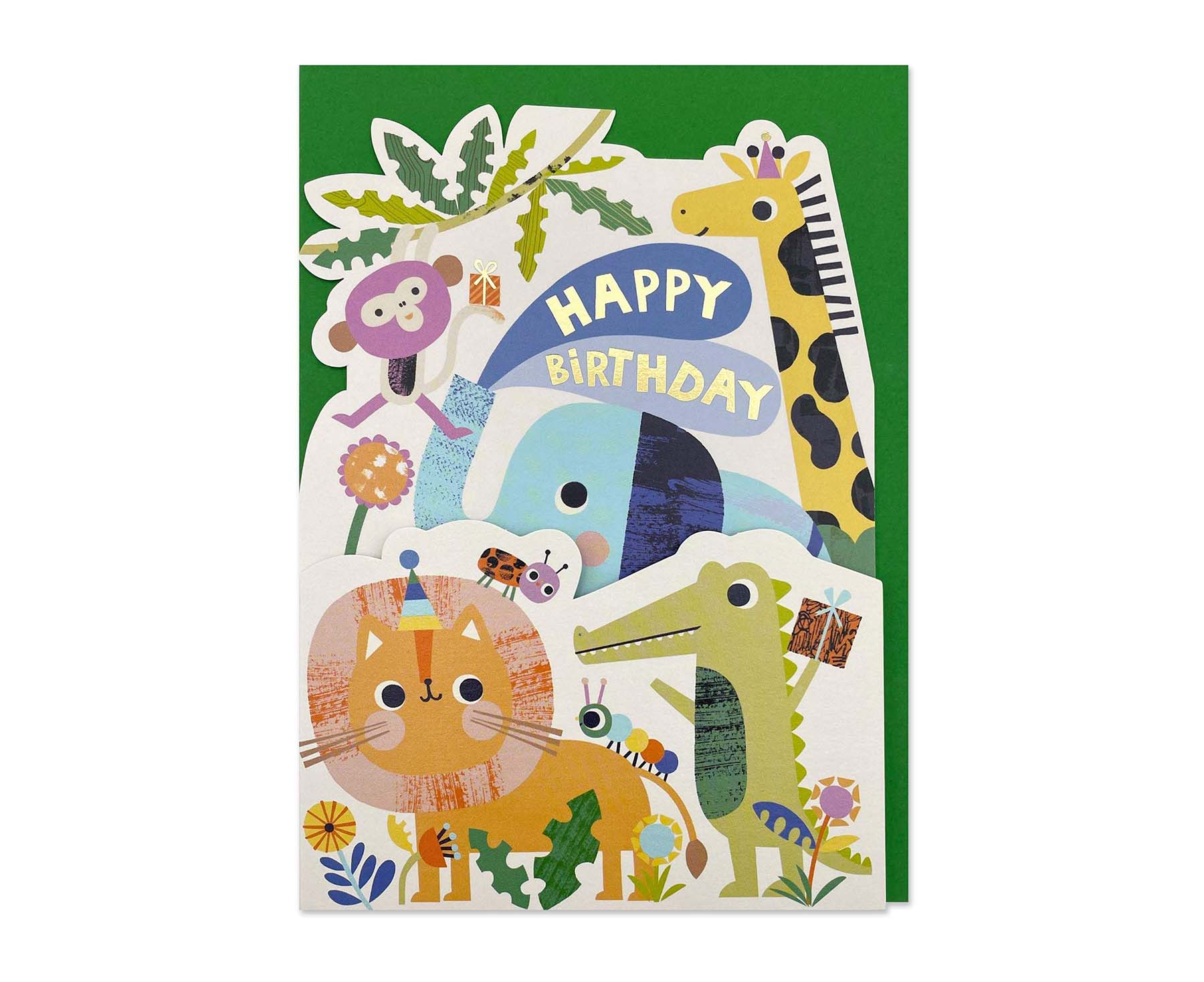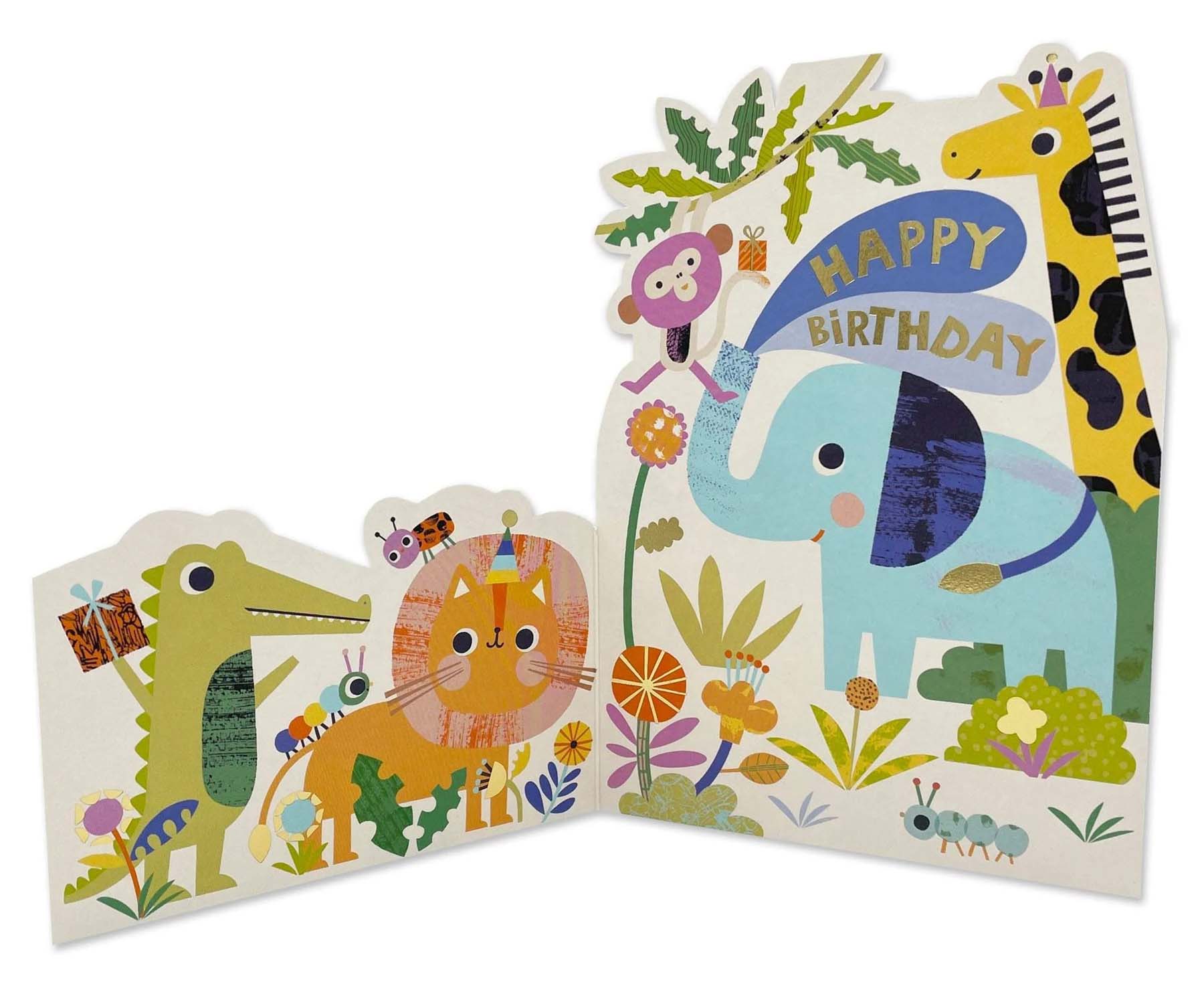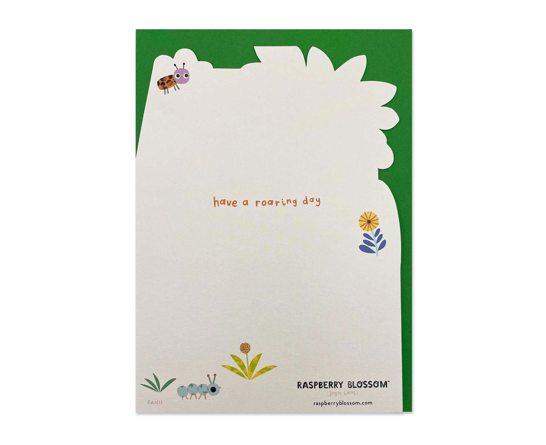 This fun birthday card from Raspberry Blossom stands out in more ways than one, it opens up to reveal a colourful scene full of animals including a lion, giraffe, crocodile and monkey, with gold details and 'Happy Birthday' lettering. The back of the card has the message 'have a roaring day' with plenty of space for your own message. It's sure to be a favourite to be displayed on a shelf long after the birthday has passed.
