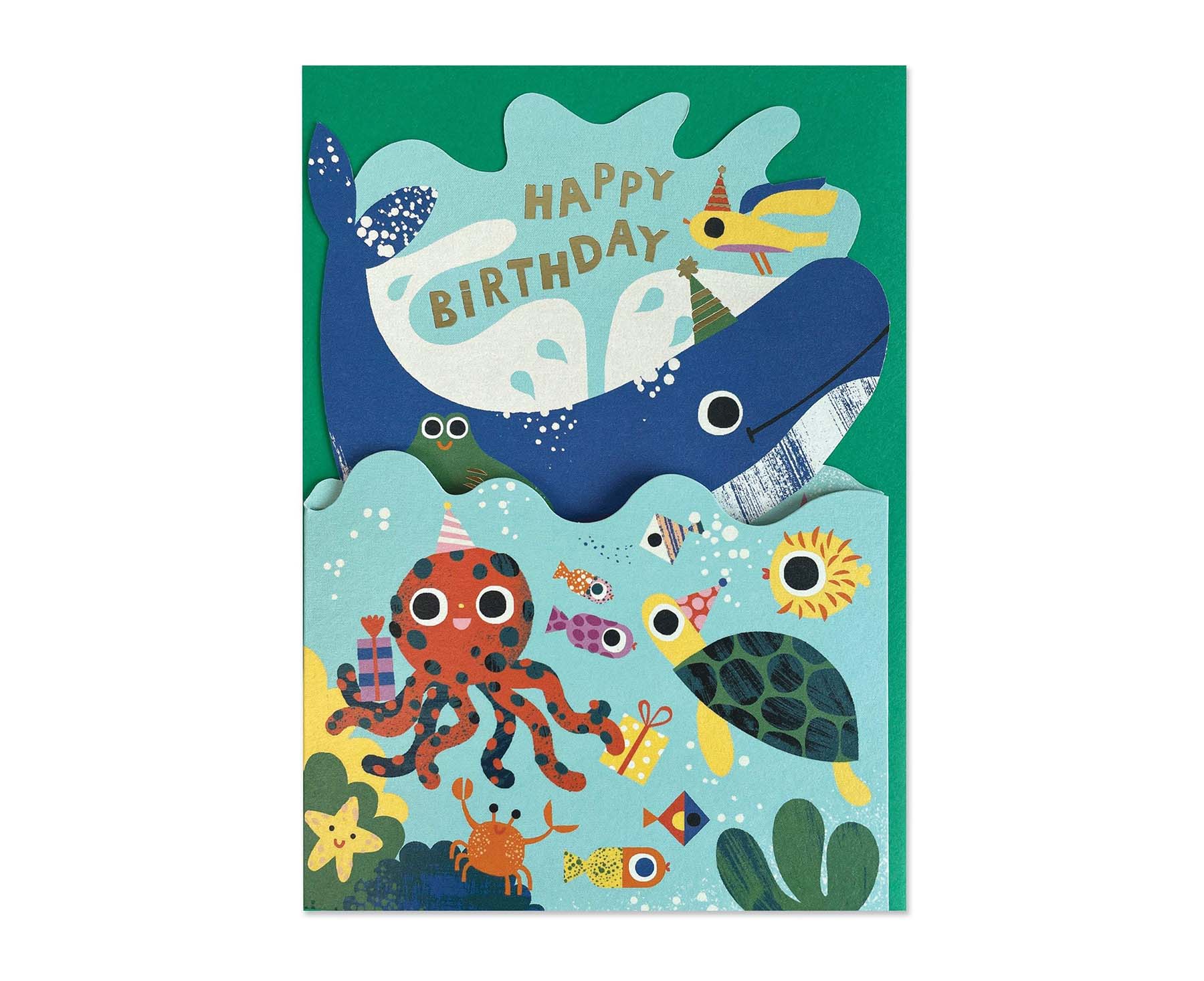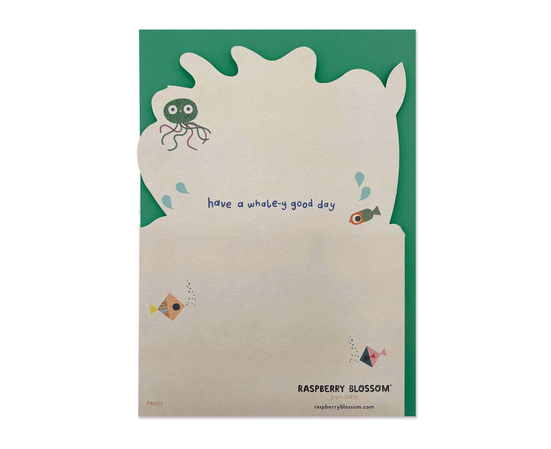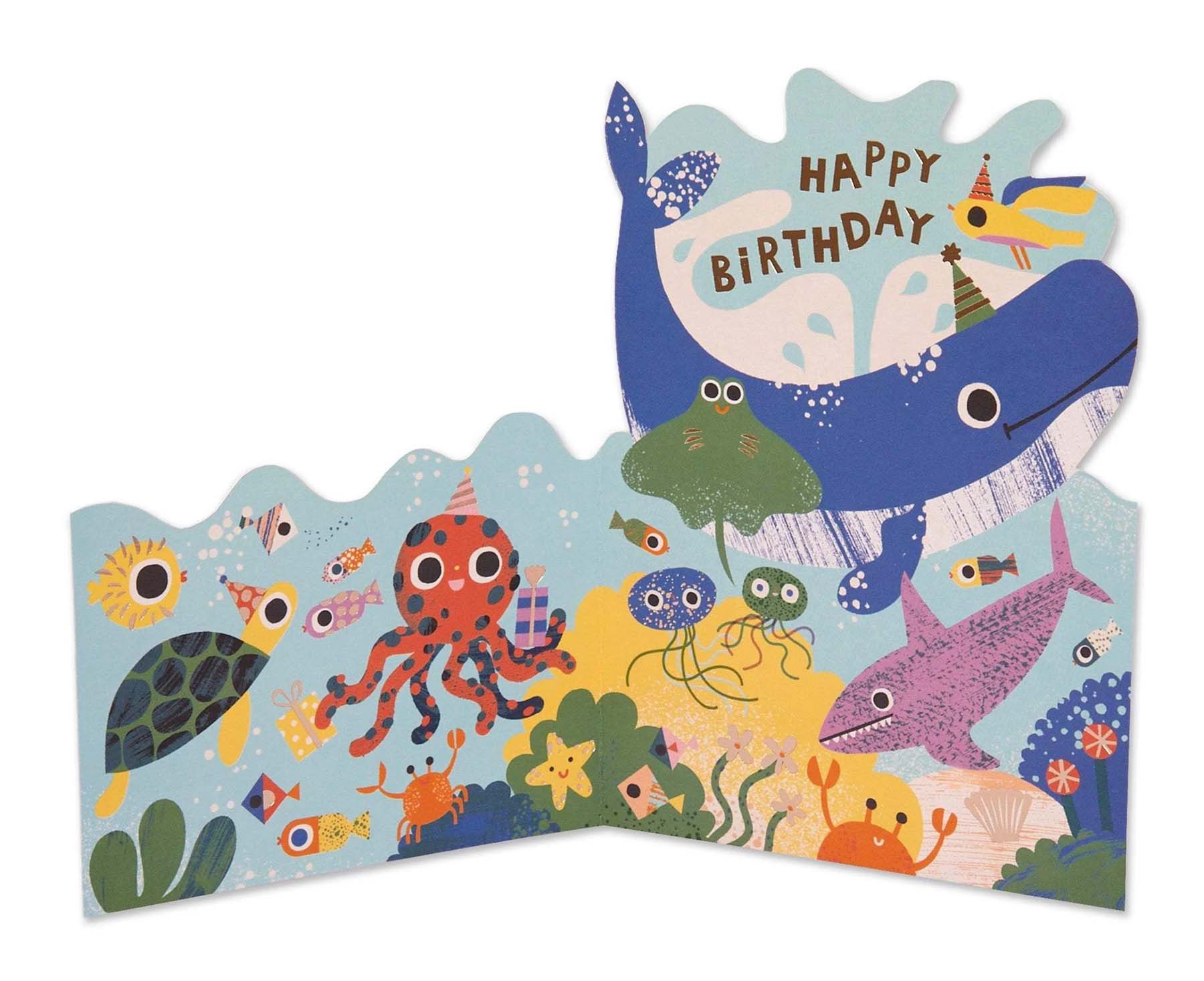 This fun birthday card from Raspberry Blossom stands out in more ways than one, it opens up to reveal a colourful underwater scene full of sea creatures including a whale, octopus, turtles and fish, with gold details and 'Happy Birthday' lettering. The back of the card has the message 'have a whale-y good birthday' with plenty of space for your own message. It's sure to be a favourite to be displayed on a shelf long after the birthday has passed.