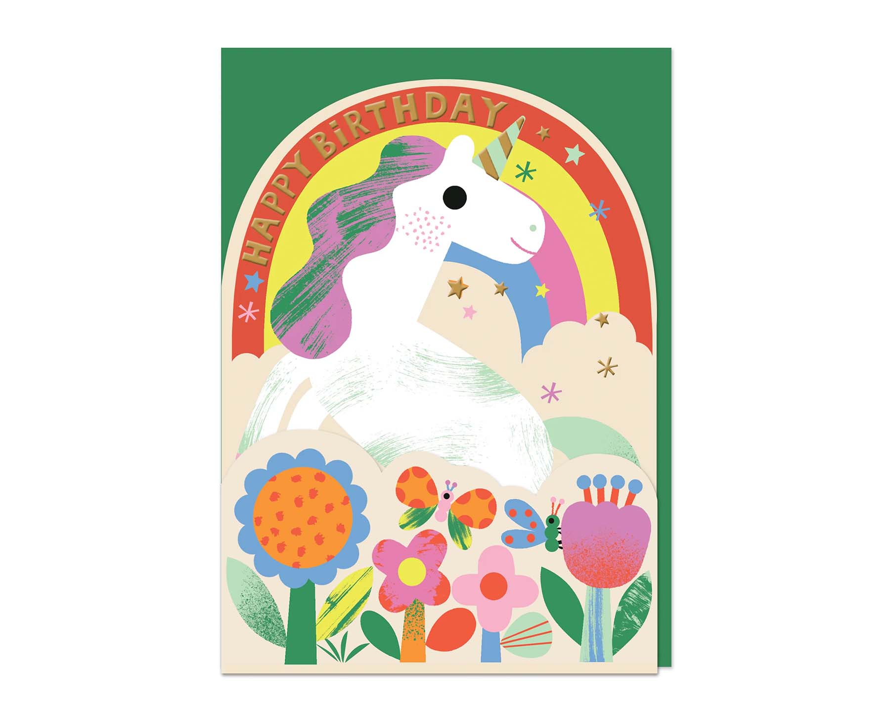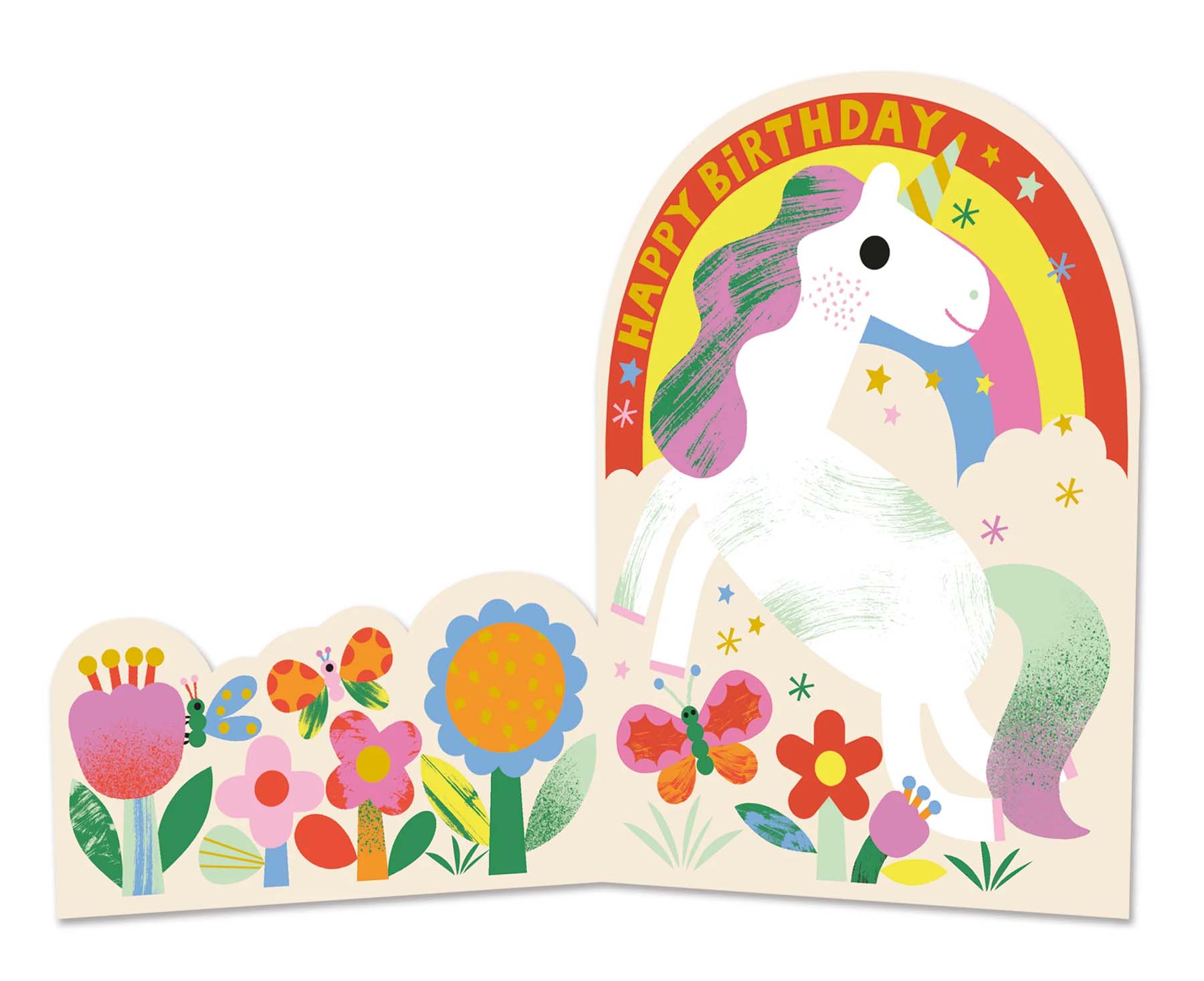 This fun birthday card from Raspberry Blossom stands out in more ways than one, it opens up to reveal a unicorn and roundabout surrounded by flowers with gold details and 'Happy Birthday' lettering. The back of the card has the message 'have a magical day' with plenty of space for your own message. It's sure to be a favourite to be displayed on a shelf long after the birthday has passed.