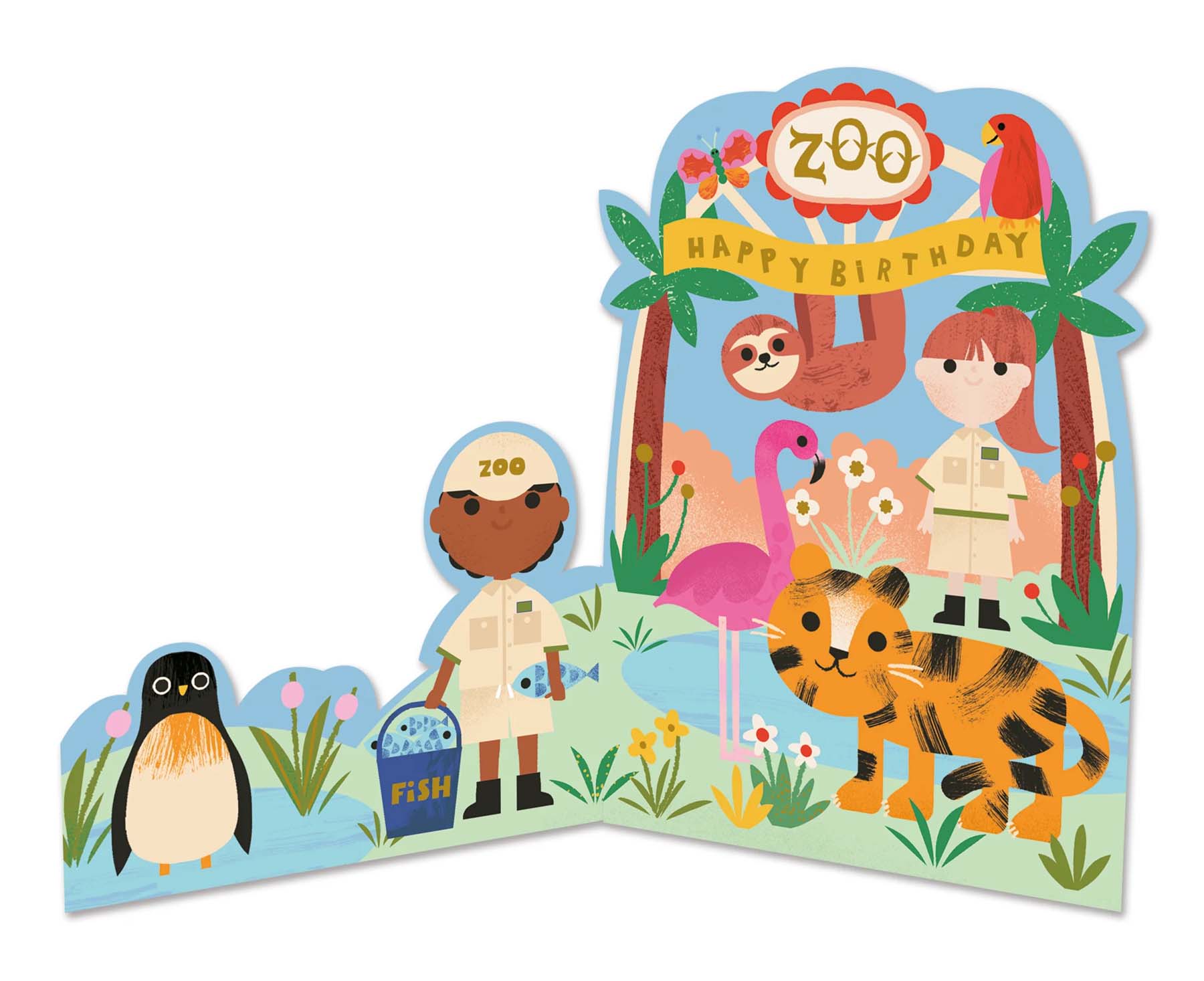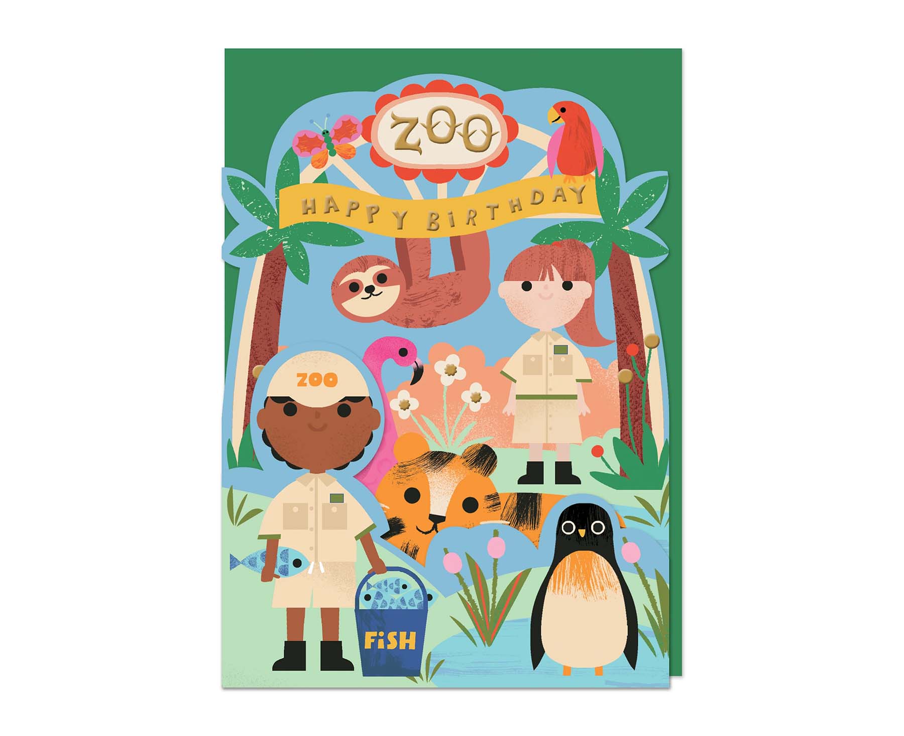 This fun birthday card from Raspberry Blossom stands out in more ways than one, it opens up to reveal a colourful zoo scene featuring zookeepers and animals including a penguin, flamingo, sloth and more, with gold details and 'Happy Birthday' lettering. The back of the card has the message 'have a zoo-per day' with plenty of space for your own message. It's sure to be a favourite to be displayed on a shelf long after the birthday has passed.