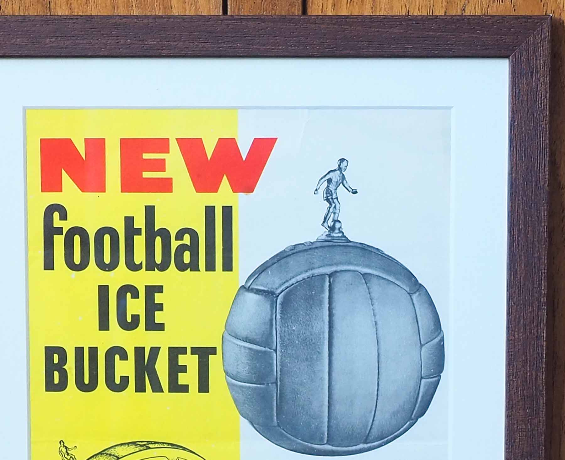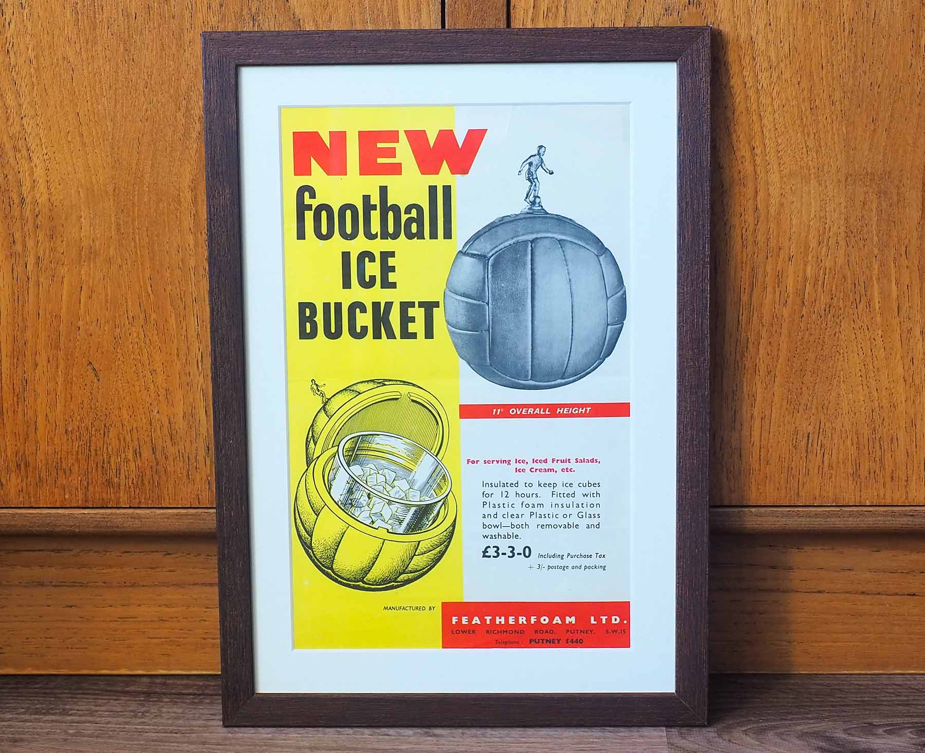 No football fan should be without a football ice bucket, or so Featherfoam Ltd believed with this fun ad. We reckon the little figure on top could Geoff Hurst himself, maybe it was even created to celebrate his ice cool winning goal in 1966! Expertly mounted and framed in a dark walnut stained wood frame, this would great on the wall wherever you watch the football.