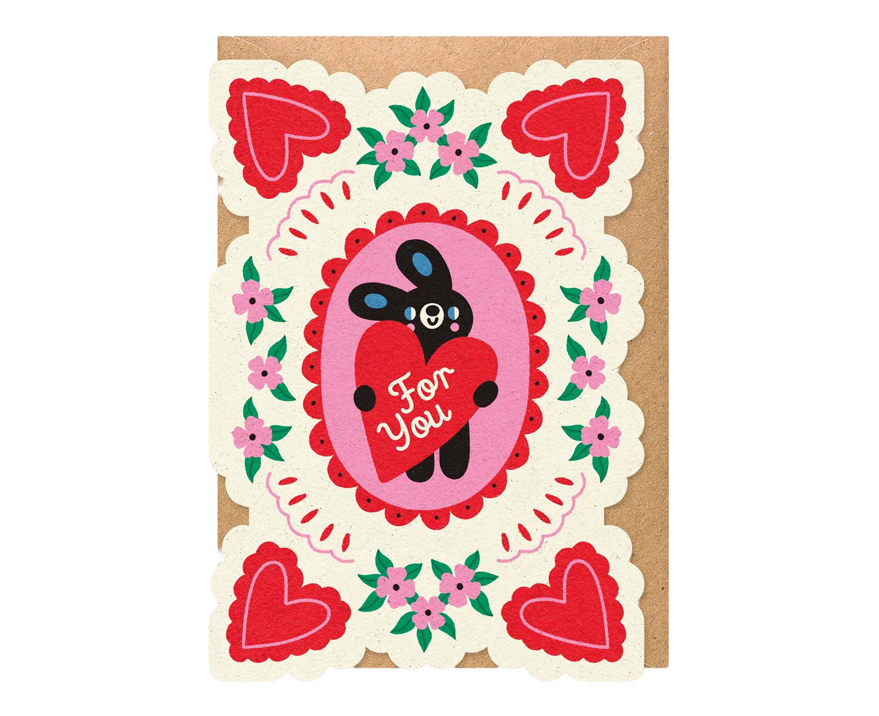 Produced in collaboration with Edyta Demurat, this gorgeous shaped card from Studio Boketto features the cutest little bunny holding a heart shaped 'For You' sign, It has beautiful scallop shaped edges with heart and floral details making it perfect as a Valentine's card, an anniversary card or just to say I love you to someone special at any time of year..