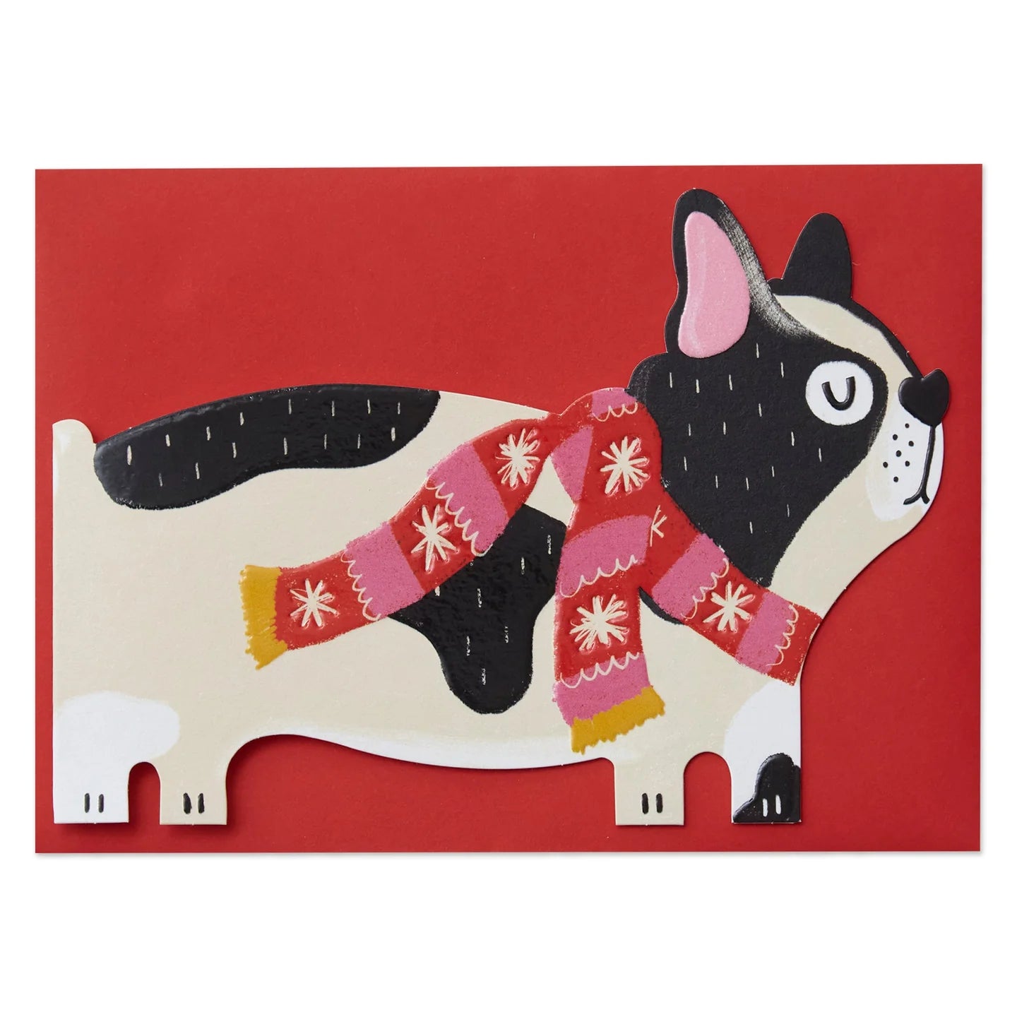 Cut to shape so it stands proudly in any festive setting, this handsome Frenchie or French Bulldog with a festive scarf Christmas card is one of a range of pawsome dog and cat cards full of joy from Raspberry Blossom.