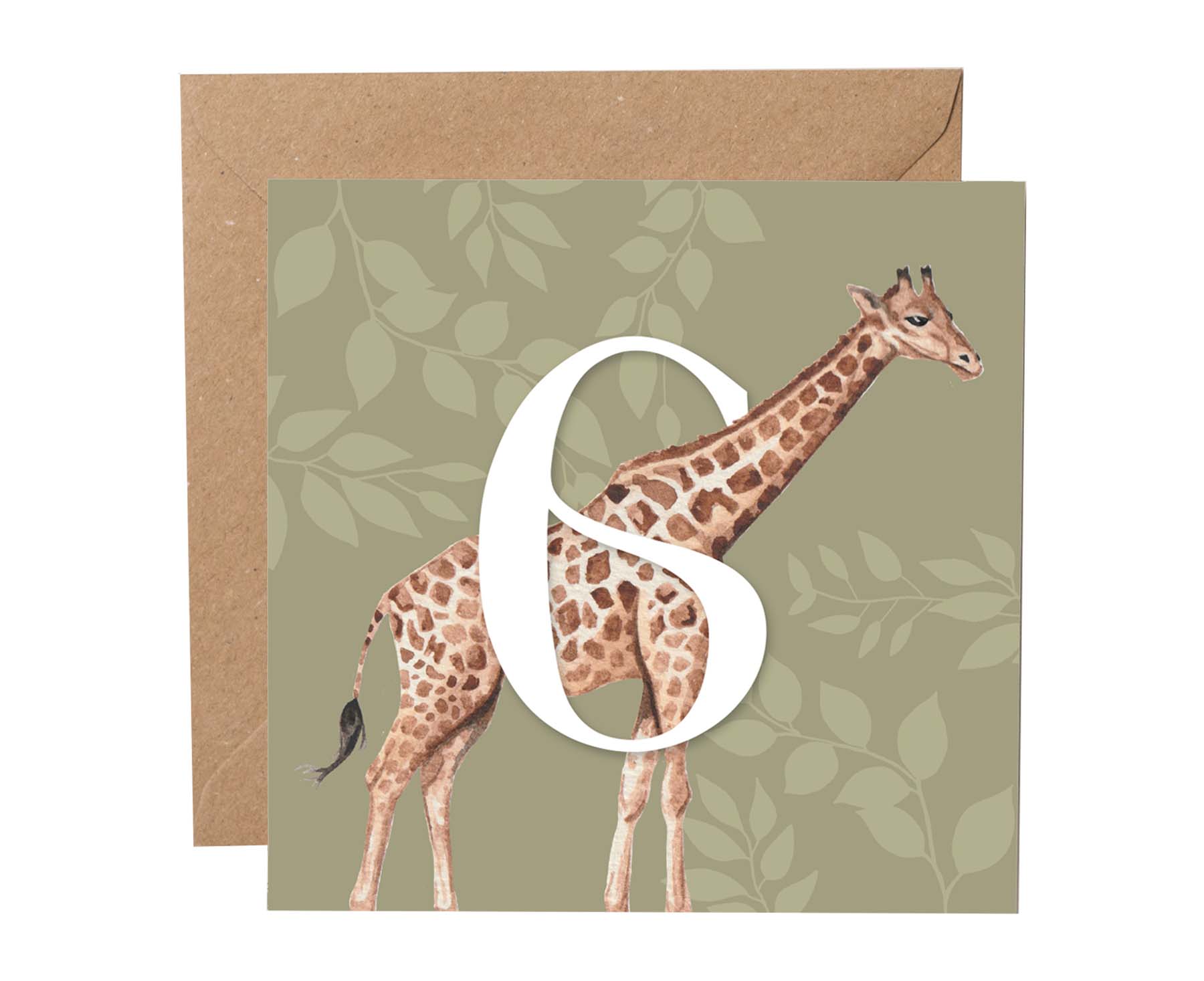 This wild sixth birthday card features a elegant giraffe and a number six. It's based on an original watercolour painting by talented Sussex based artist Georgi, otherwise known as lil wabbit.