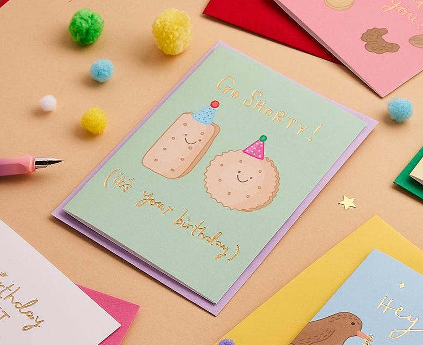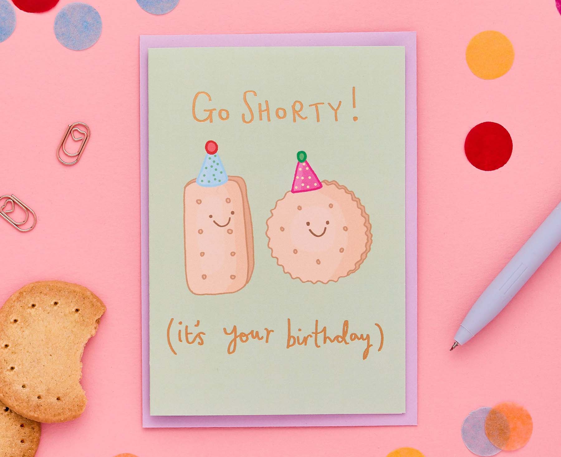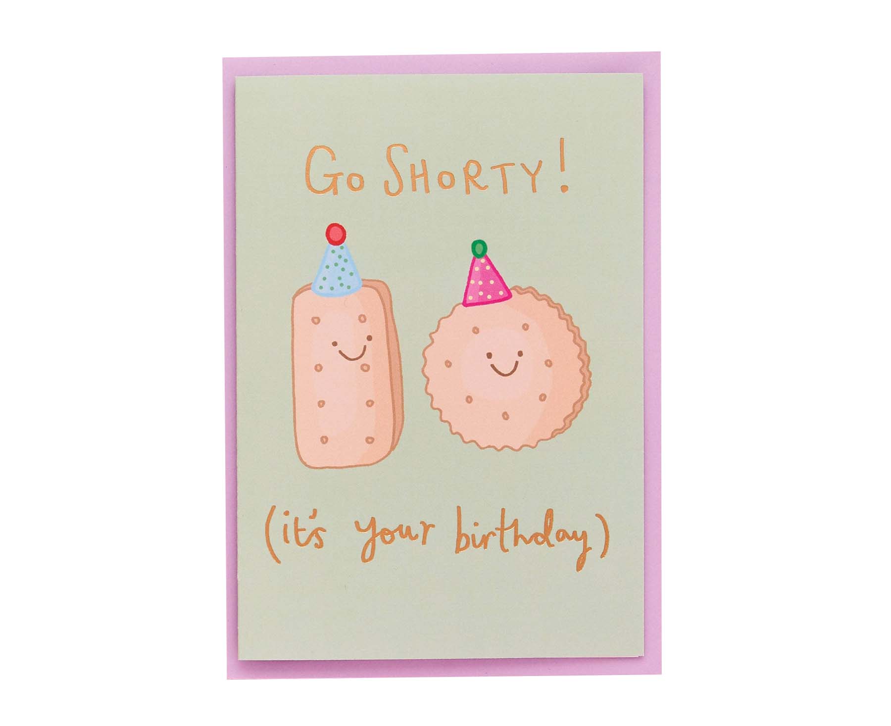 Featuring a cute pair of smiling shortbread biscuits in party hats, this card is beautifully illustrated and features a hand written message in gold foil that reads 'Go Shorty! (it's your birthday).' It comes with a coordinating lilac envelope.