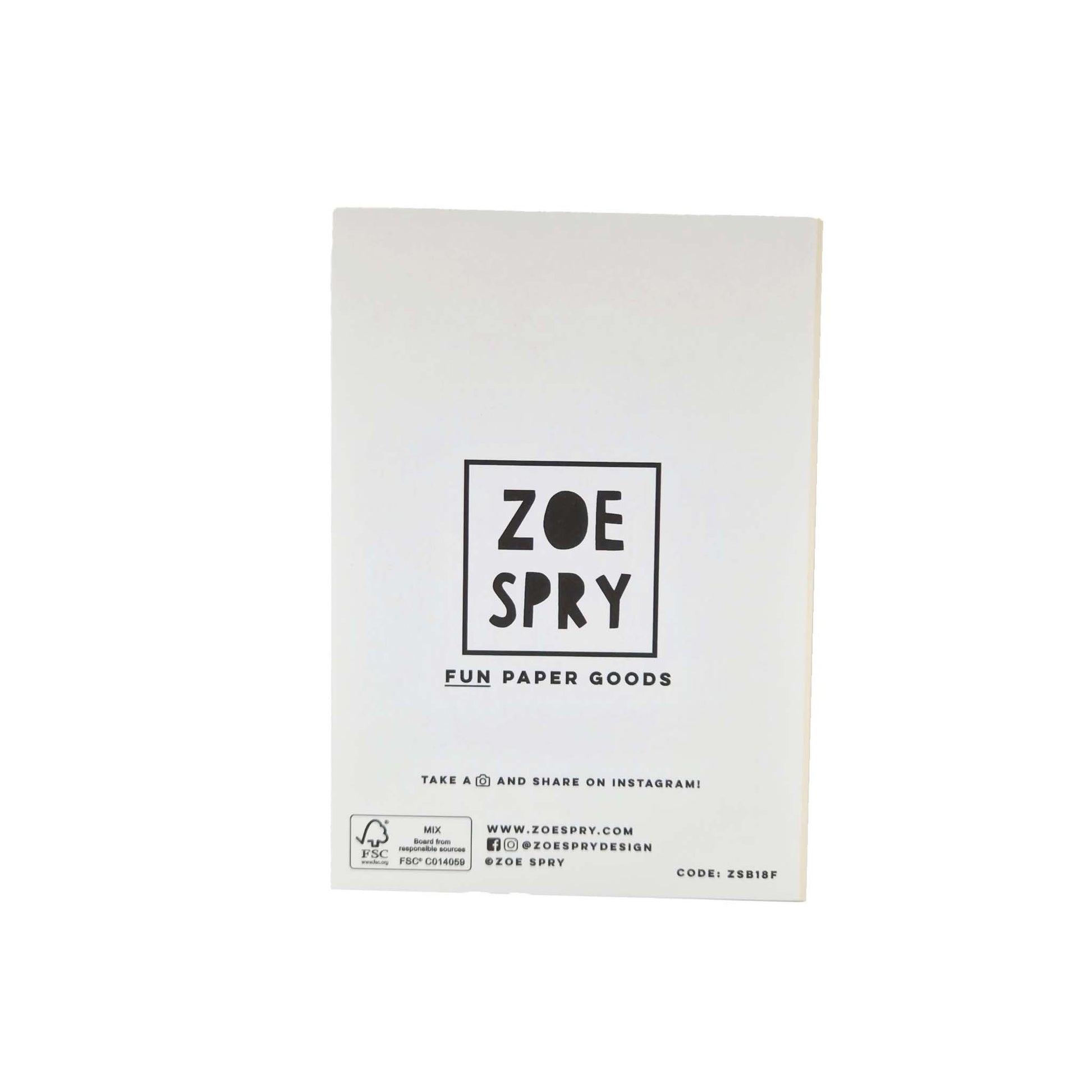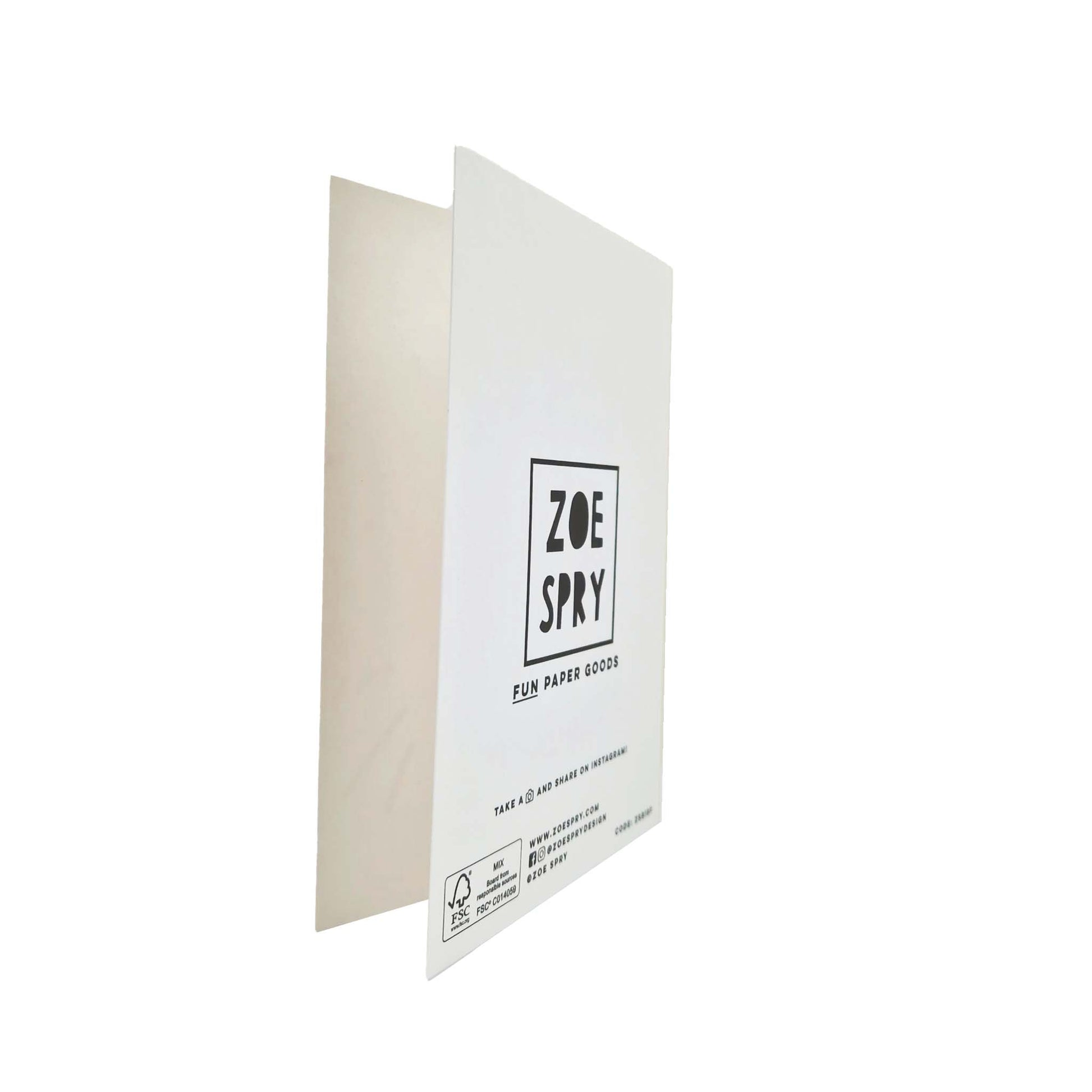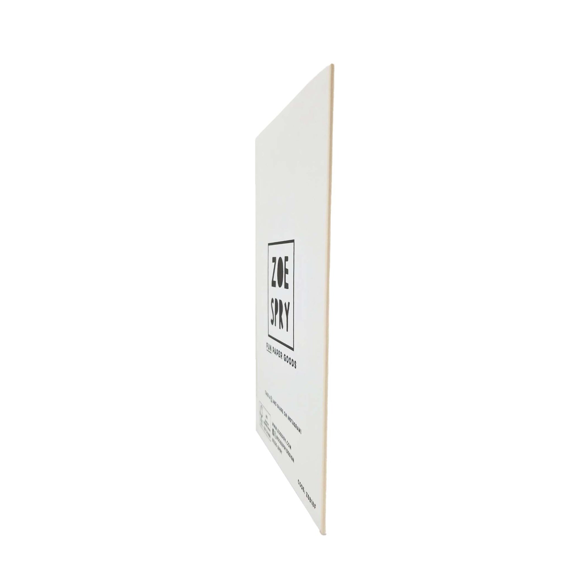 A6, printed on 300gsm FSC certified board, blank inside, supplied with a brown kraft envelope in a compostable bio wrapper.