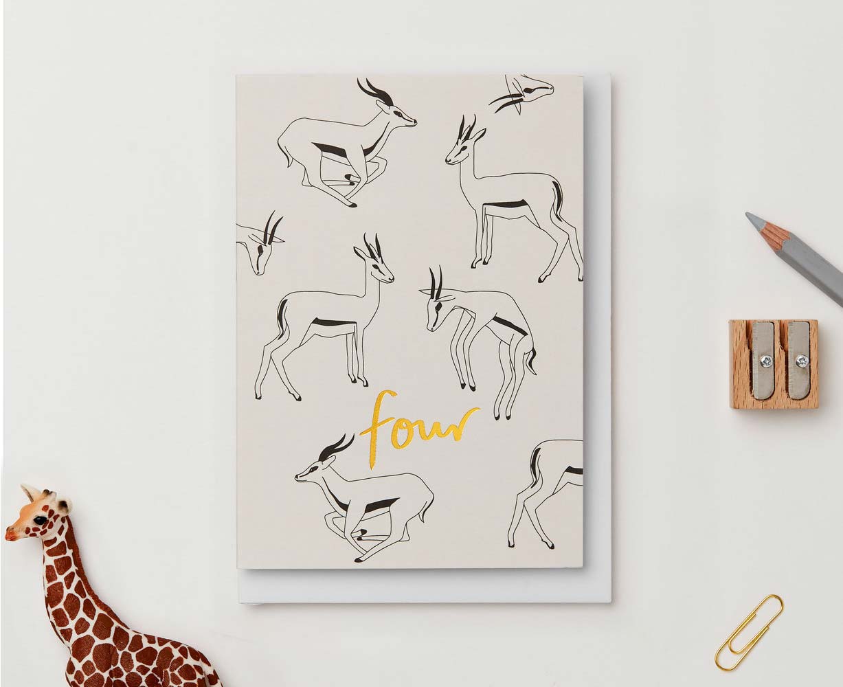 Hand-lettered birthday card featuring an illustrated gazelle design with gold-foiled ‘four,' this Fourth Birthday card by Kinshipped is plastic free and printed with vegetable inks on FSC approved papers. Part of their Serengeti series, Kinshipped will be donating 10% of the proceeds from this card range to the WWF for their work in the Serengeti Mau-Mara.