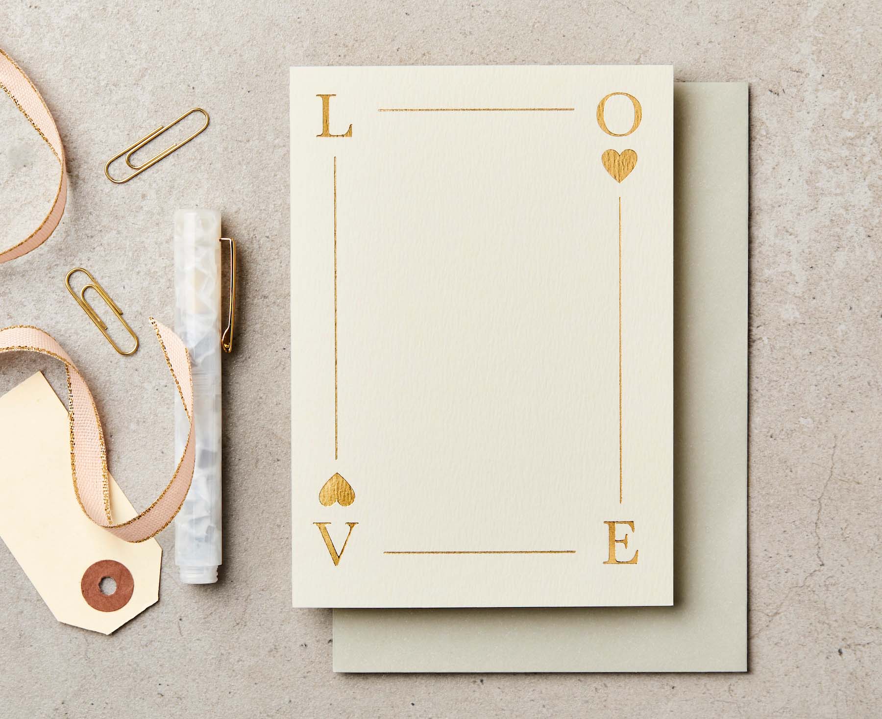 With its gorgeous gold foiled playing card design, this Love card is perfect for Valentines day, as an anniversary card, a wedding card, or for any time of the year you just want to remind someone special what they mean to you.
