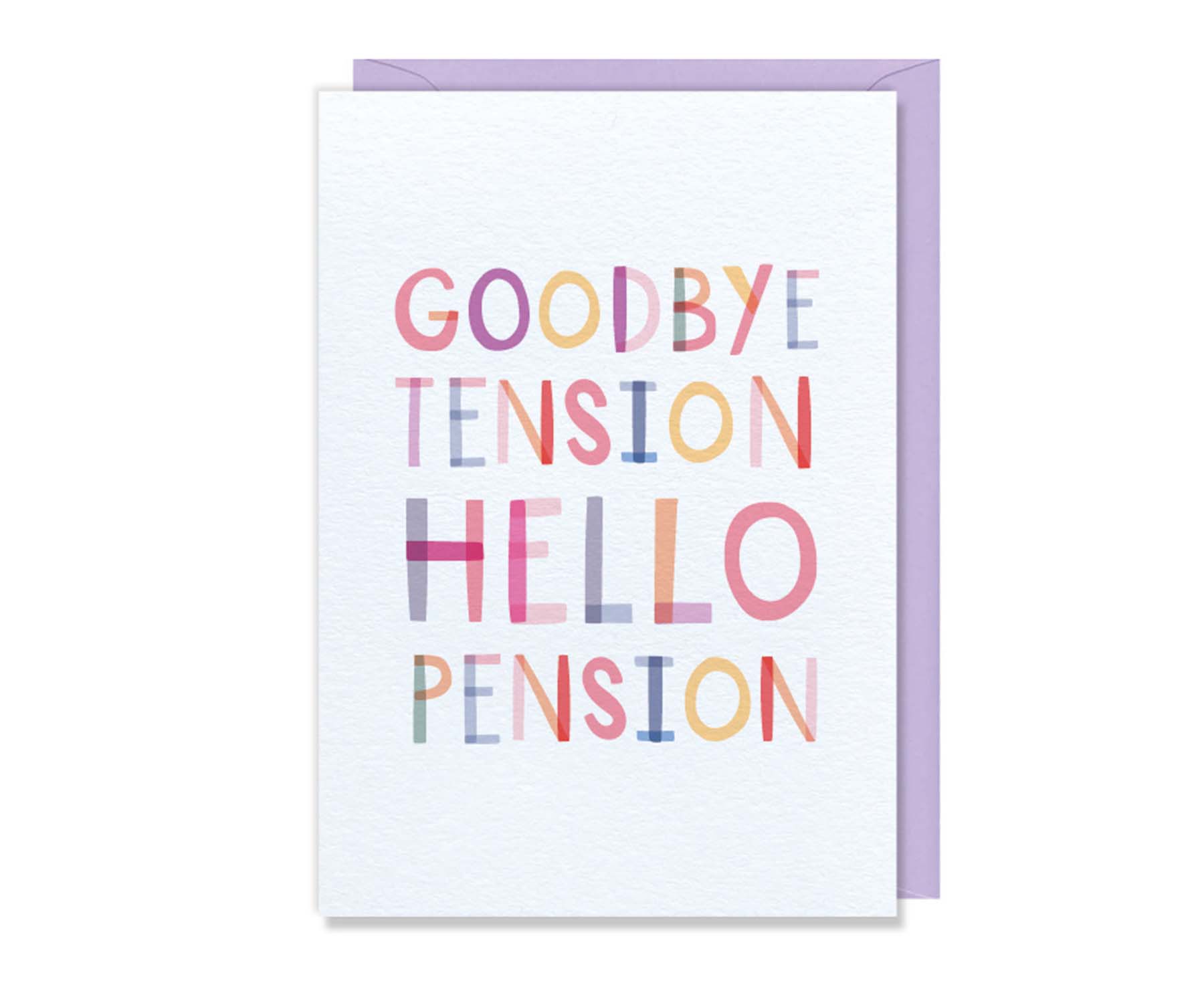 This bright shiny retirement card features hand drawn typography saying 'Goodbye tension hello pension' finished in multicoloured foiling. It's the perfect way to wish someone good luck in their new chapter of retirement, and is one of many colourful uplifting cards from Two for Joy Illustration.