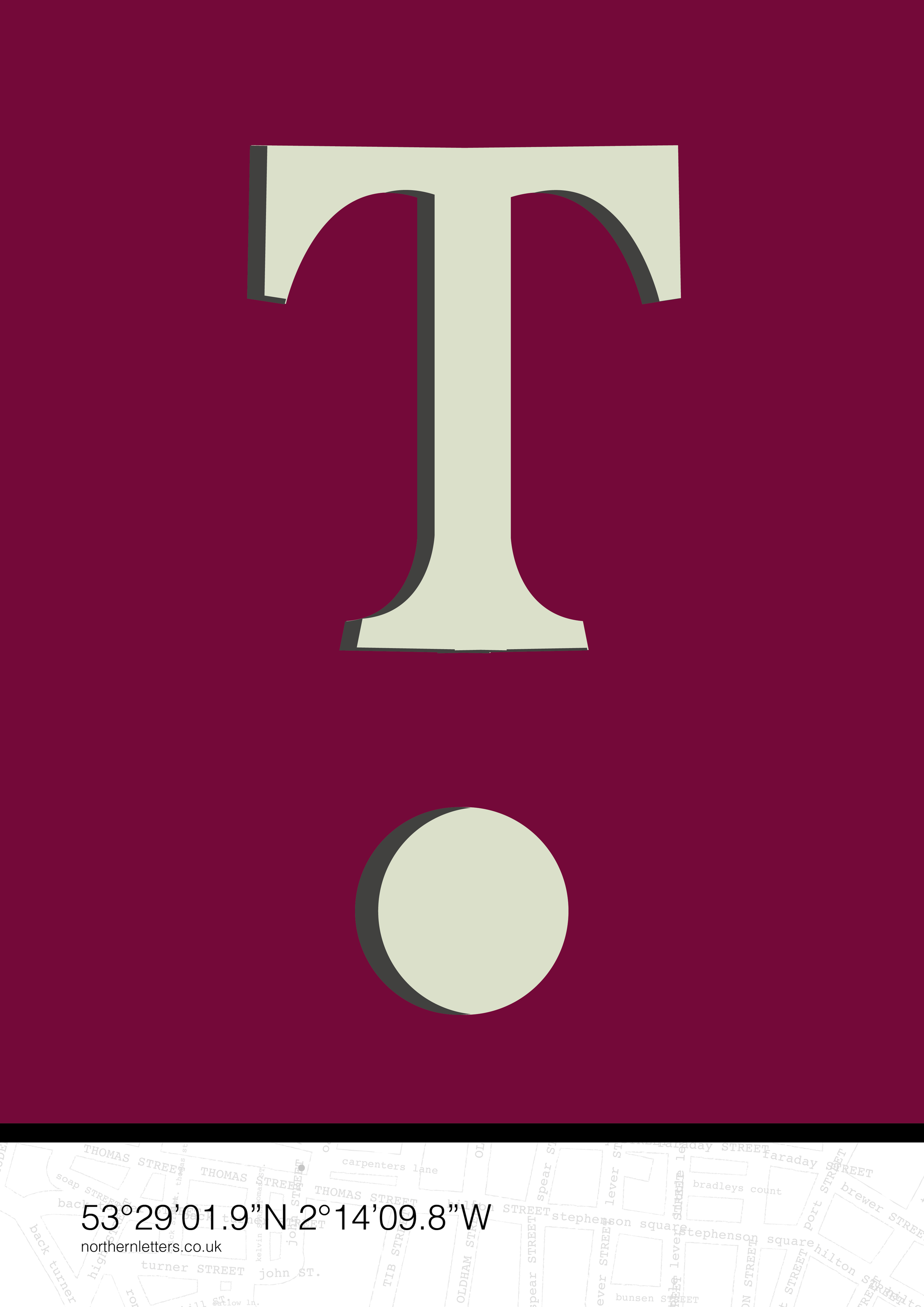 With a bonus bit of punctuation, this delightful serif letter T makes a sophisticated statement with its deep rich colouring.