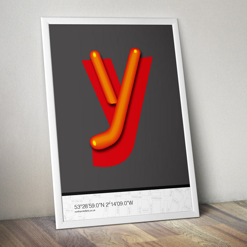 When it comes to signage and lettering, neon is about as punchy as it gets. The neon letter Y from a record shop window is recreated beautifully in this print. Letters m and f in this same style were actually commissioned as signs for toilets in a restaurant. True story.