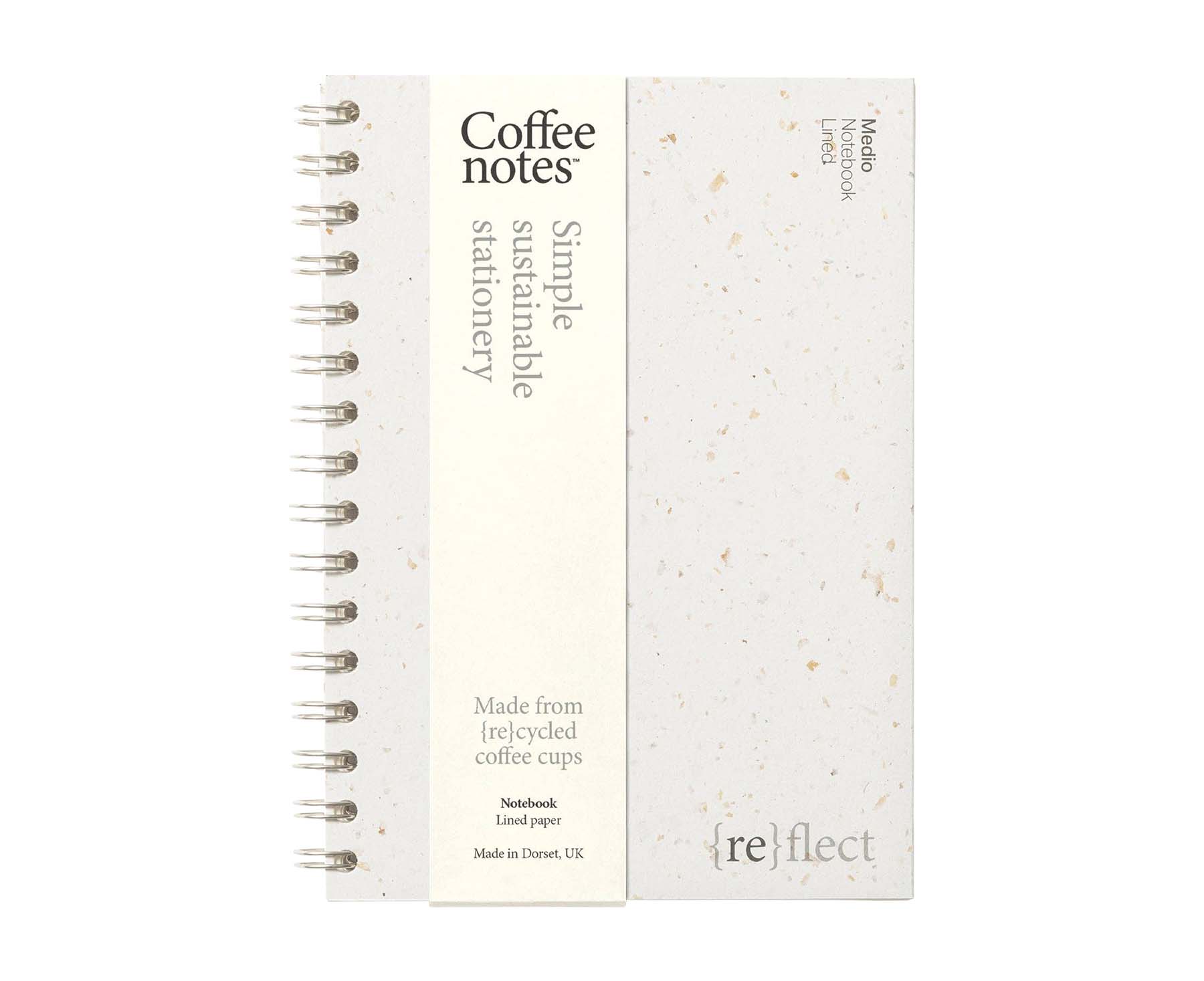 Made from recycled coffee cup paper and featuring a coffee grounds cover. This is a gorgeous 160 page wirebound A5 notebook with lined pages. The binding wire is plastic free and the covers are entirely glue free, making the whole thing fully recyclable in your household waste or compost.